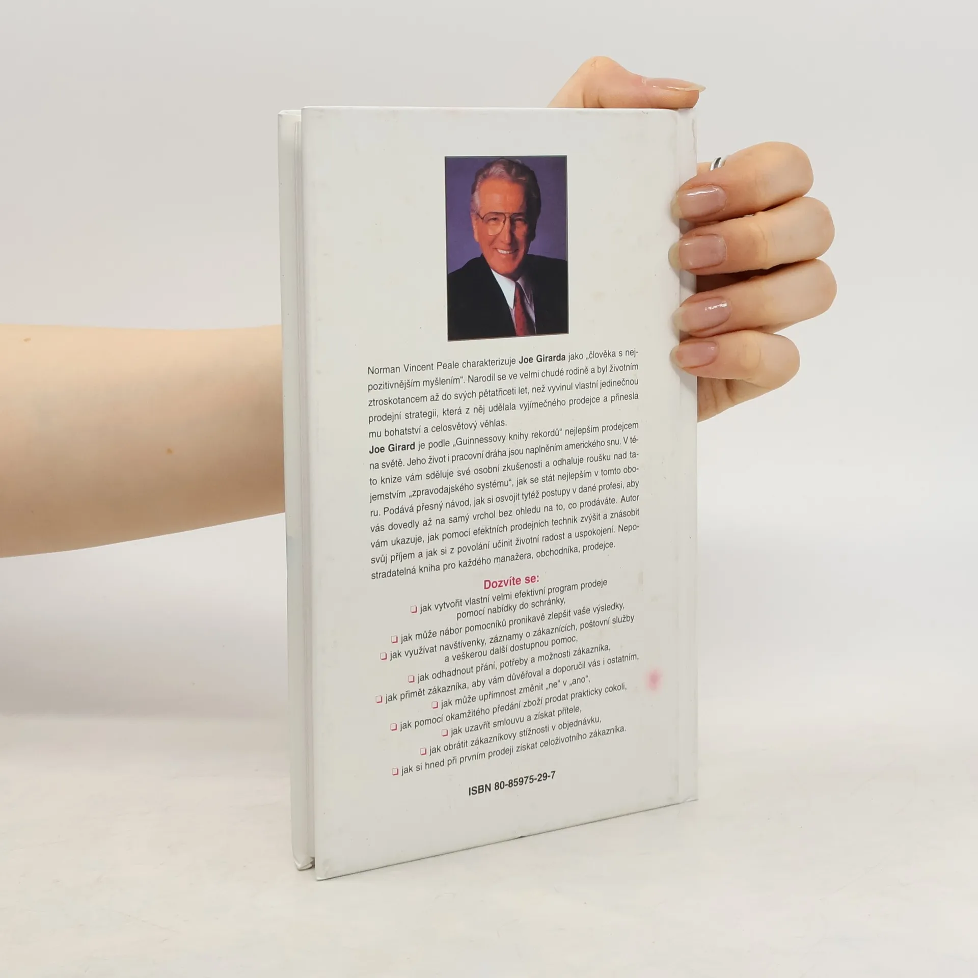 N.V.Peale charakterizuje J.Girarda ako človeka s najpozitívnejším myslením. Narodil sa vo veľmi chudobnej rodine a bol životným stroskotancom až do svojich 35 rokov, než vyvinul vlastnú jedinečnú predajnú stratégiu, ktorá z neho urobila výnimočného predajcu a priniesla mu bohatstvo a celosvetový ohlas. J.Girard je podľa Guinessovej knihy rekordov najlepším predajcom na svete. Jeho život a pracovná dráha sú naplnením Amerického sna. Autor vám ukazuje, ako pomocou efektných predajných techník zvýšiť a znásobiť svoj príjem, a ako si z povolania urobiť životnú radosť a uspokojenie. Dozviete sa okrem iného, ako uzavrieť zmluvu a získať priateľov, ako obrátiť zákazníkove sťažnosti na objednávku, ako si ihneď pri prvom predaji získať celoživotného zákazníka.