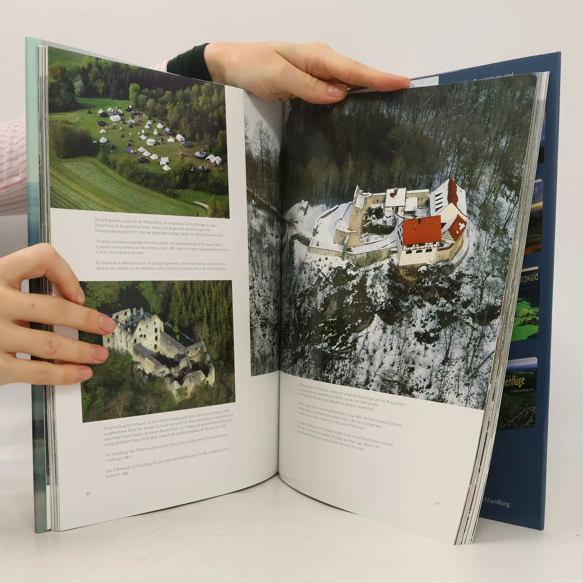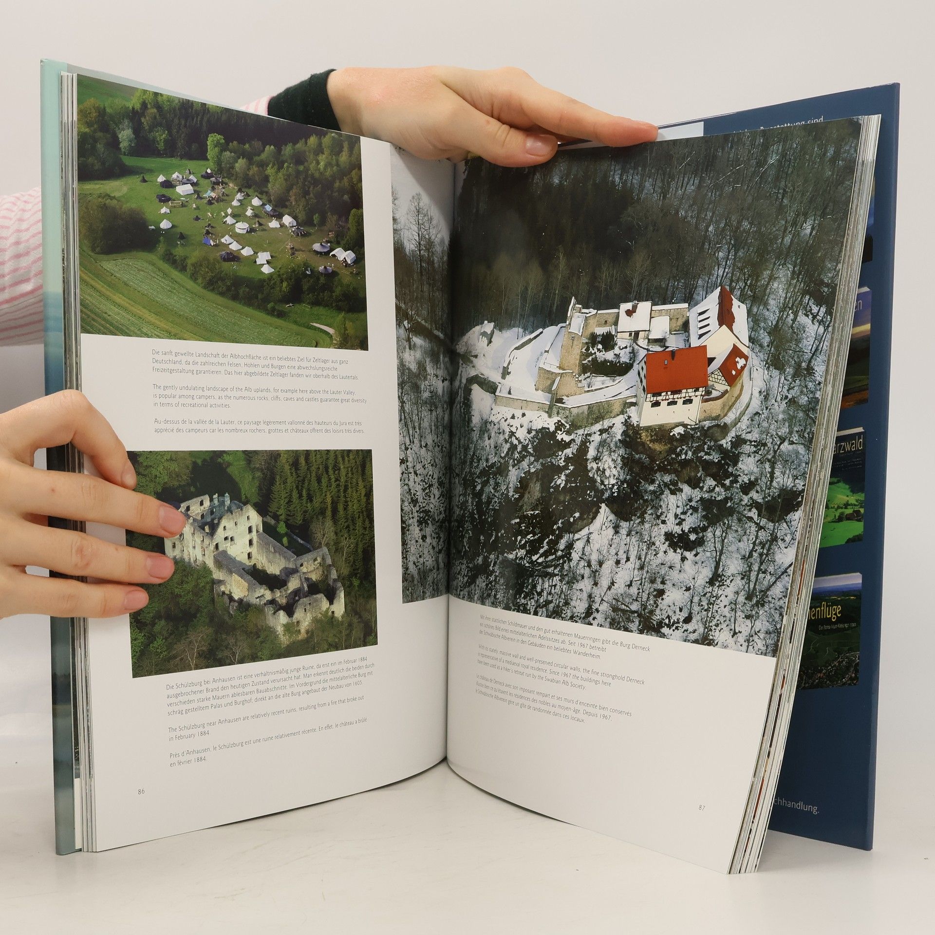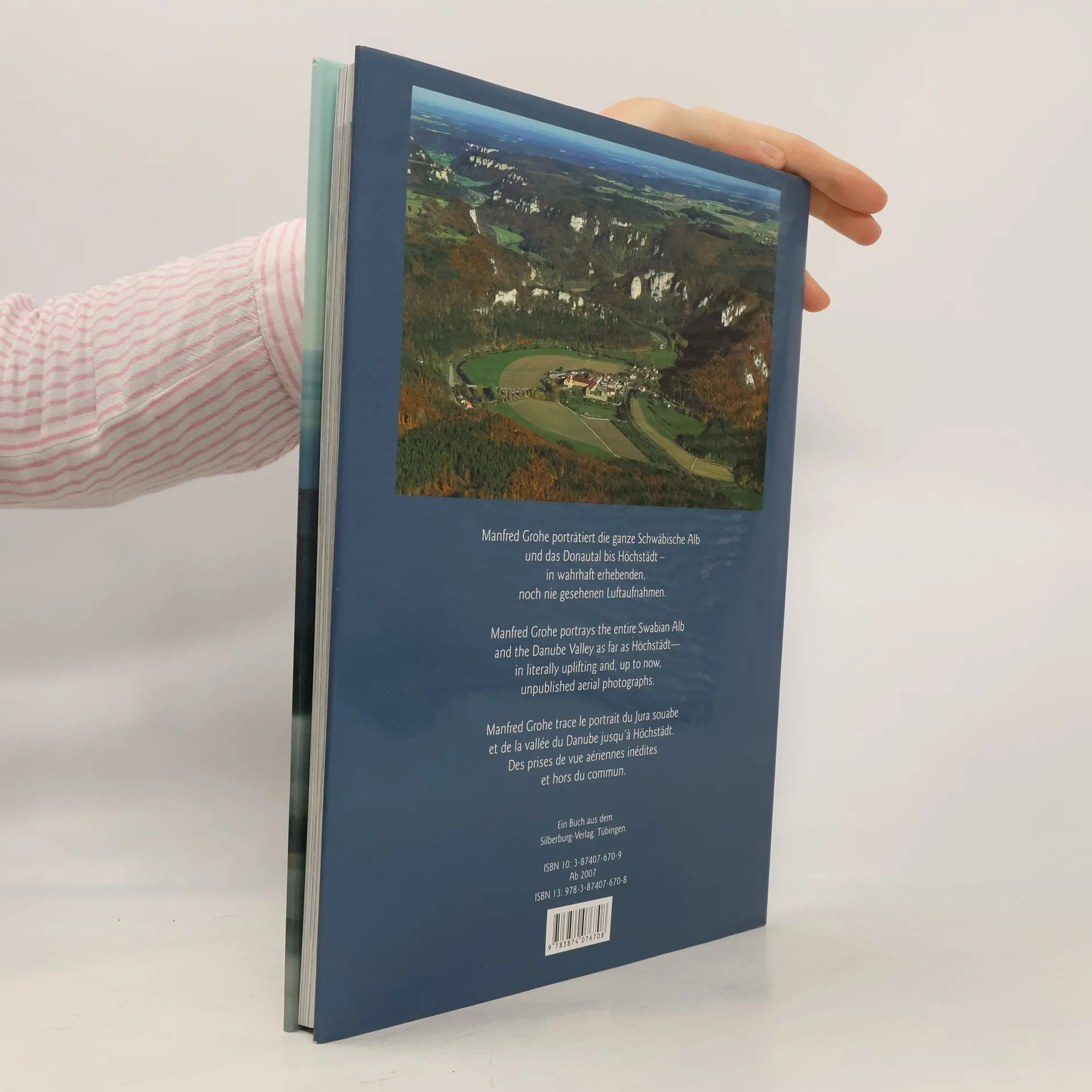 Aus der Vogelperspektive wirkt die Welt unten auf der Erde zart und verspielt. Es eröffnen sich einzigartige Blicke auf Flüsse, Gebäude und Menschen. Manfred Grohe porträtiert die ganze Schwäbische Alb und das Donautal bis Günzburg in wahrhaft erhebenden Luftaufnahmen. Wer mit diesem spektakulären Bildband abhebt, sollte schwindelfrei sein, denn die Schönheit der Luftaufnahmen raubt dem Betrachter mitunter den Atem: Die überflutete Donau erinnert an eine Seenplatte und Burgen liegen wie Perlen im Schnee. Wiesenflüsschen zeichnen Mäander und der Albtrauf mit seinen unzähligen Faltenwürfen scheint sich zum Horizont hin im Blau des Dunstes aufzulösen. Dieser großformatige Luftbildband zeigt das Herzstück Baden-Württembergs. Erläutert werden die Motive von dem bekannten Geographen und Historiker Harald Schukraft in deutsch, englisch und französisch. Wer das Donautal und die Schwäbische Alb liebt, wird auch diesen wunderbaren Bildband in sein Herz schließen.