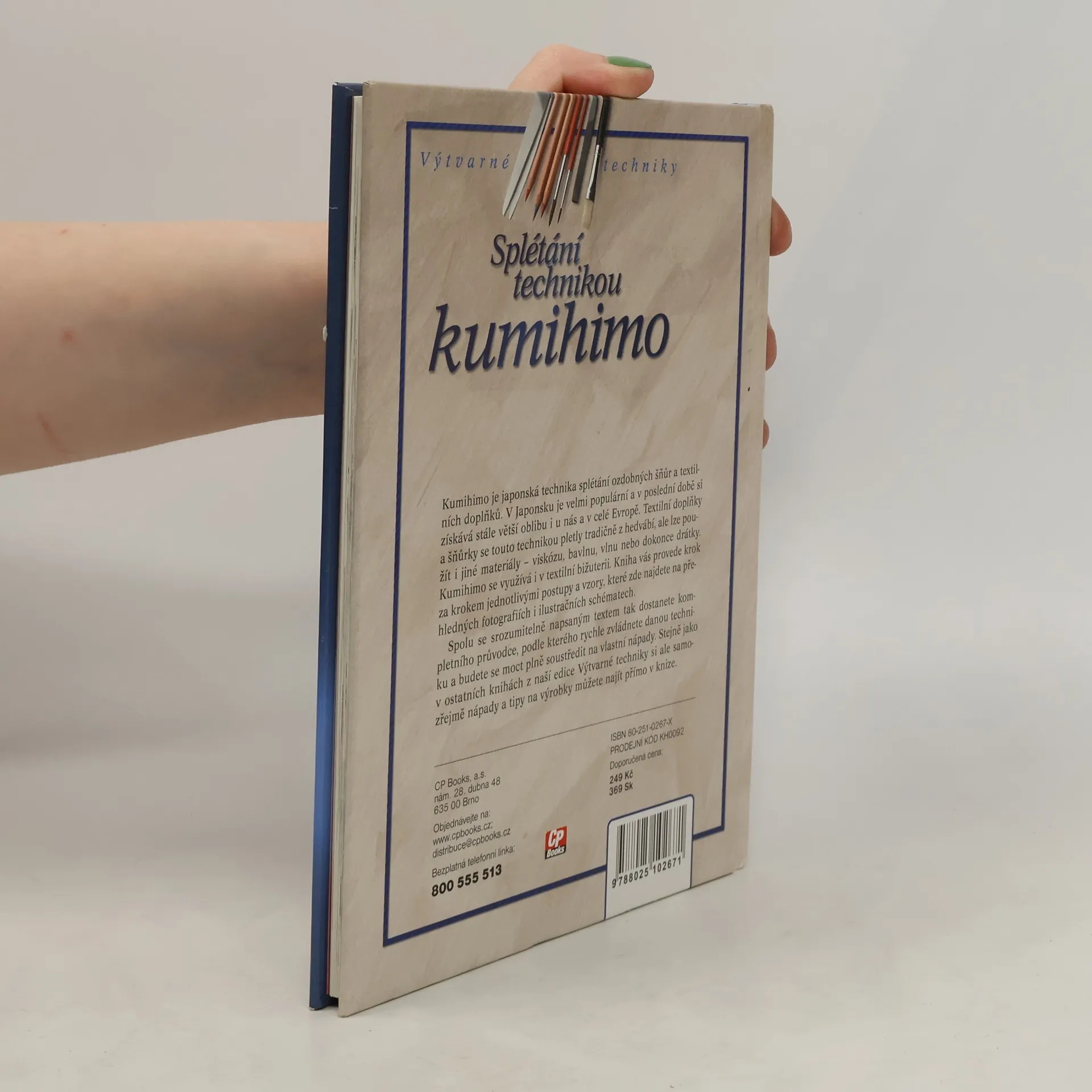 Kumihimo je japonská technika splétání ozdobných šňůr a textilních doplňků. V Japonsku je velmi populární a v poslední době si získává stále větší oblibu i u nás a v celé Evropě. Textilní doplňky a šňůrky se touto technikou pletly tradičně z hedvábí, ale lze použít i jiné materiály – viskózu, bavlnu, vlnu nebo dokonce drátky. Kumihimo se využívá i v textilní bižuterii. Kniha vás provede krok za krokem jednotlivými postupy a vzory, které zde najdete na přehledných fotografiích i ilustračních schématech. Spolu se srozumitelně napsaným textem tak dostanete kompletního průvodce, podle kterého rychle zvládnete danou techniku a budete se moct plně soustředit na vlastní nápady. Stejně jako v ostatních knihách z naší edice Výtvarné techniky si ale samozřejmě nápady a tipy na výrobky můžete najít přímo v knize.