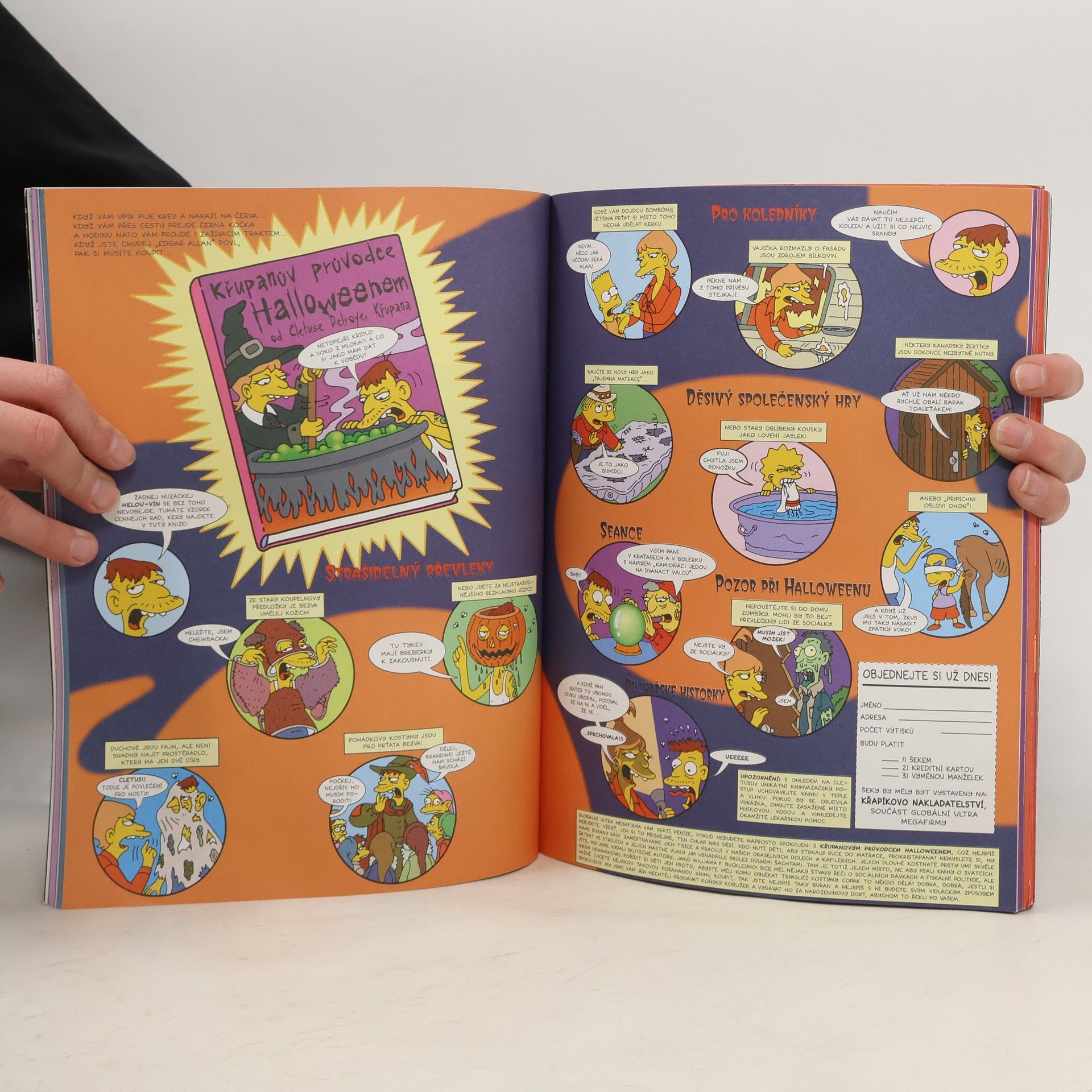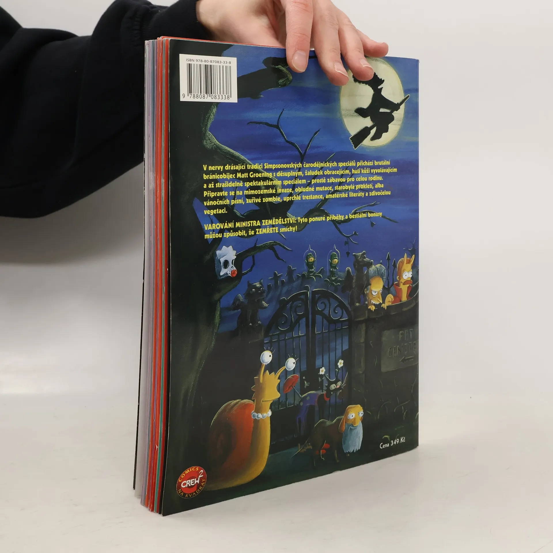 V nervy drásající tradici Simpsonovských čarodějnických speciálů přichází brutální bránicobijec Matt Groening s děsuplným, žaludek obracejícím, husí kůži vyvolávajícím a až strašidelně spektaktulárním speciálem – prostě zábavou pro celou rodinu. Připravte se na mimozemské invaze, obludné mutace, starobylá prokletí, alba vánočních písní, zuřivé zombie, uprchlé trestance, amatérské literáty a zdivočelou vegetaci. Příběhy: Levák Blob! - Paul Dini, Bill Morrison, Tim Bavington Ségra s ďáblem v těle - Peter Bagge, Stephanie Gladden, Tim Bavington Imigrace zlodějů těl! - Evan Dorkin, Bill Morrison, Stephanie Gladden, Phil Ortiz Říkejte mi Homer - Jeff Smith, Stephanie Gladden, Bill Morrison Bartovi lidé - James Robinson, Chris Roman, Bill Morrison Homer ještě nevečeřel - Mike Allred, Luis Escobar, Bill Morrison