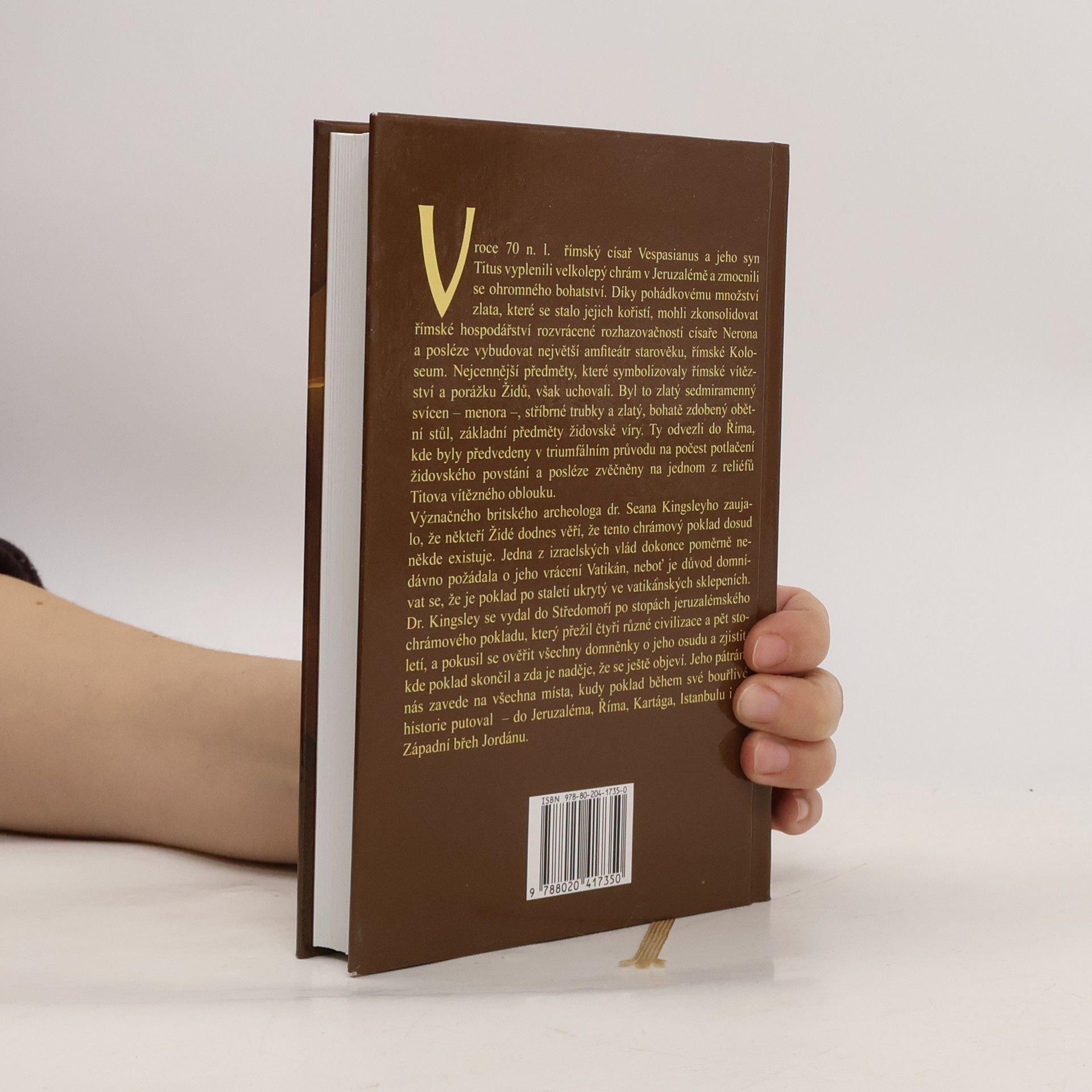 V roce 70 n. l. římský císař Vespasianus a jeho syn Titus vyplenili velkolepý chrám v Jeruzalémě a zmocnili se ohromného bohatství. Díky pohádkovému množství zlata, které se stalo jejich kořistí, mohli zkonsolidovat římské hospodářství rozvrácené rozhazovačností císaře Nerona a posléze vybudovat největší amfiteátr starověku, římské Koloseum. Nejcennější předměty, které symbolizovaly římské vítězství moc a porážku Židů, však uchovali. Byl to zlatý sedmiramenný svícen menora , stříbrné trubky a zlatý, bohatě zdobený obětní stůl, základní předměty židovské víry. Ty odvezli do Říma, kde byly předvedeny v triumfálním průvodu na počest potlačení židovského povstání a posléze zvěčněny na jednom z reliéfů Titova vítězného oblouku. Význačného britského archeologa dr. Seana Kingsleyho zaujalo, že někteří Židé dodnes věří, že tento chrámový poklad dosud někde existuje. Jedna z izraelských vlád dokonce poměrně nedávno požádala o jeho vrácení Vatikán, neboť je důvod domnívat se, že je poklad po staletí ukrytý ve vatikánských sklepeních. Dr. Kingsley se vydal do Středomoří po stopách jeruzalémského chrámového pokladu, který přežil čtyři různé civilizace a pět století, a pokusil se ověřit všechny domněnky o jeho osudu a zjistit, kde poklad skončil a zda je naděje, že se ještě objeví. Jeho pátrání nás zavede na všechna místa, kudy poklad během své bouřlivé historie putoval -- do Jeruzaléma, Říma, Kartága, Istanbulu i na Západní břeh Jordánu.