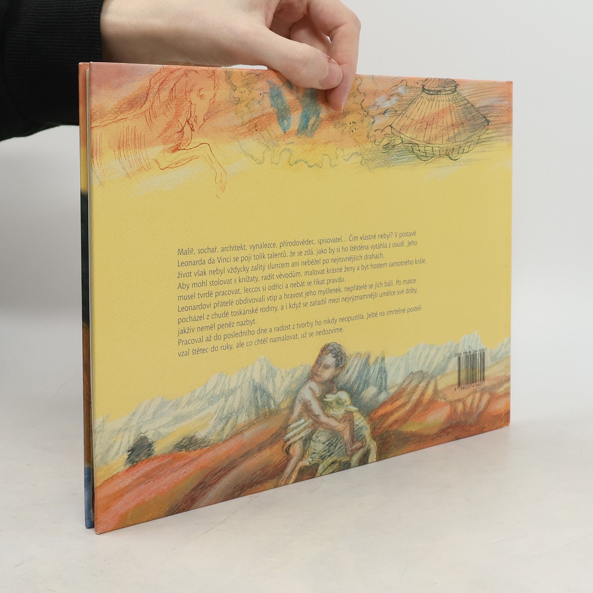 Literární příběh života Leonarda da Vinci, opírající se o známá fakta. Výpravná ilustrovaná publikace přibližuje život a dílo jedné z nejvýznamnějších osobností všech dob. Slovem i obrazem zavede čtenáře do Leonardova rodného města i do Florencie, kde strávil léta učení, a samozřejmě také do Francie, kde působil na dvoře krále Františka I. a kde posléze zemřel. V knize jsou v obrazových parafrázích připomenuta umělcova nejvýznačnější výtvarná díla (Poslední večeře, Dáma s hranostajem, Mona Lisa, autoportrét aj.), jeho objevy a vynálezy (např. létací stroje atd.) i poznatky ze studií.