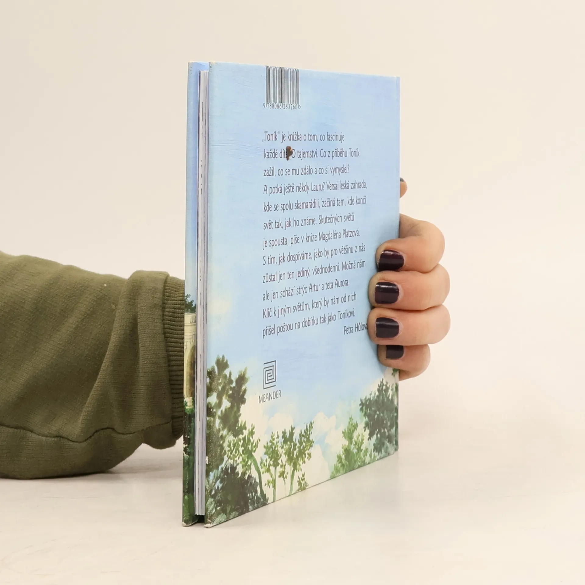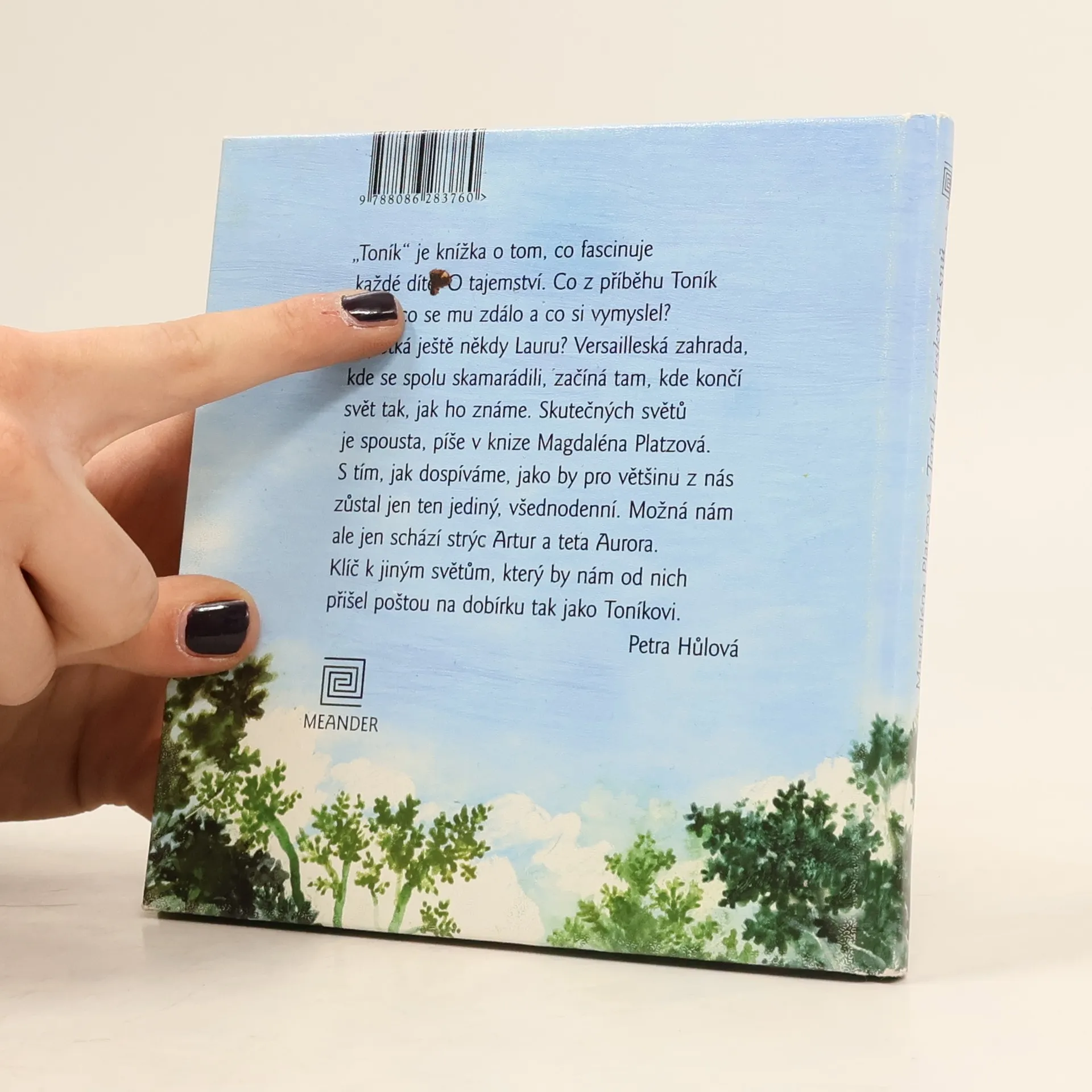 "Toník" je knížka o tom, co fascinuje každé dítě. O tajemství. Co z příběhu Toník zažil, co se mu zdálo a co si vymyslel? A potká ještě někdy Lauru? Versailleská zahrada, kde se spolu skamarádili, začíná tam, kde končí svět tak, jak ho známe. Skutečných světů je spousta, píše v knize Magdaléna Platzová. S tím, jak dospíváme, jako by pro většinu z nás zůstal jen ten jediný, všednodenní. Možná nám ale jen schází strýc Artur a teta Aurora. Klíč k jiným světům, který by nám od nich přišel poštou na dobírku tak jako Toníkovi.