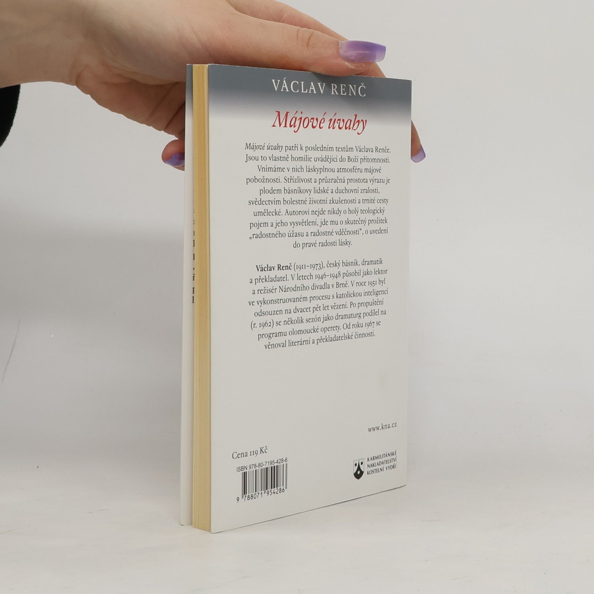 Májové úvahy patří k posledním textům Václava Renče (1911-1973), českého katolického básníka a dramatika. Po jeho smrti byly tyto úvahy publikovány v Katolických novinách (1974-75) a znovu v Katolickém týdeníku (1994-95), některé s mírnými úpravami. V knižní podobě vyšly v roce 1996 jako neprodejný tisk. Dílo je čtenářsky prověřené a zaslouží si širší pozornost. Pro zasvěcené čtenáře Renčova díla je nápadná jednoduchá a disciplinovaná forma úvah. Tato střízlivost a prostota výrazu odráží básníkovu lidskou a duchovní zralost, vycházející z bolestných životních zkušeností a umělecké cesty. Renč přetváří mladistvou abstraktní esejistiku a polemickou publicistiku do střídmého a vroucího projevu. Renč, narozený ve Vodochodech, žil od dětství v Praze a vystudoval filozofii a jazykovědu na Karlově univerzitě. Pracoval pro literární časopis a působil jako lektor a režisér. V roce 1951 byl nespravedlivě odsouzen na 25 let vězení, z něhož byl propuštěn v roce 1962. Po propuštění se věnoval dramaturgii a literární činnosti. Kromě reflexivní lyriky psal divadelní hry a rozhlasové dramatizace, a podílel se na aktualizaci katolických mešních písní.