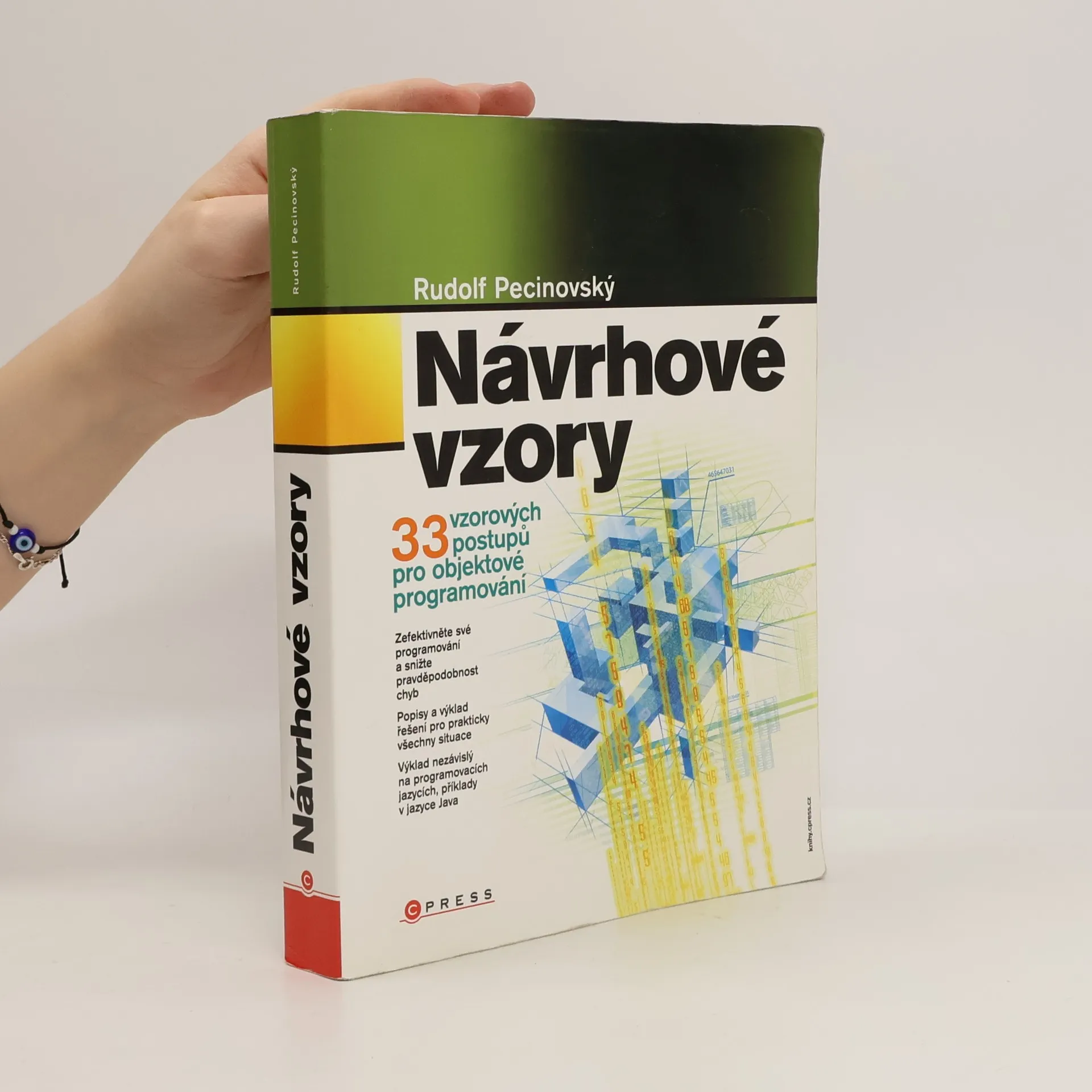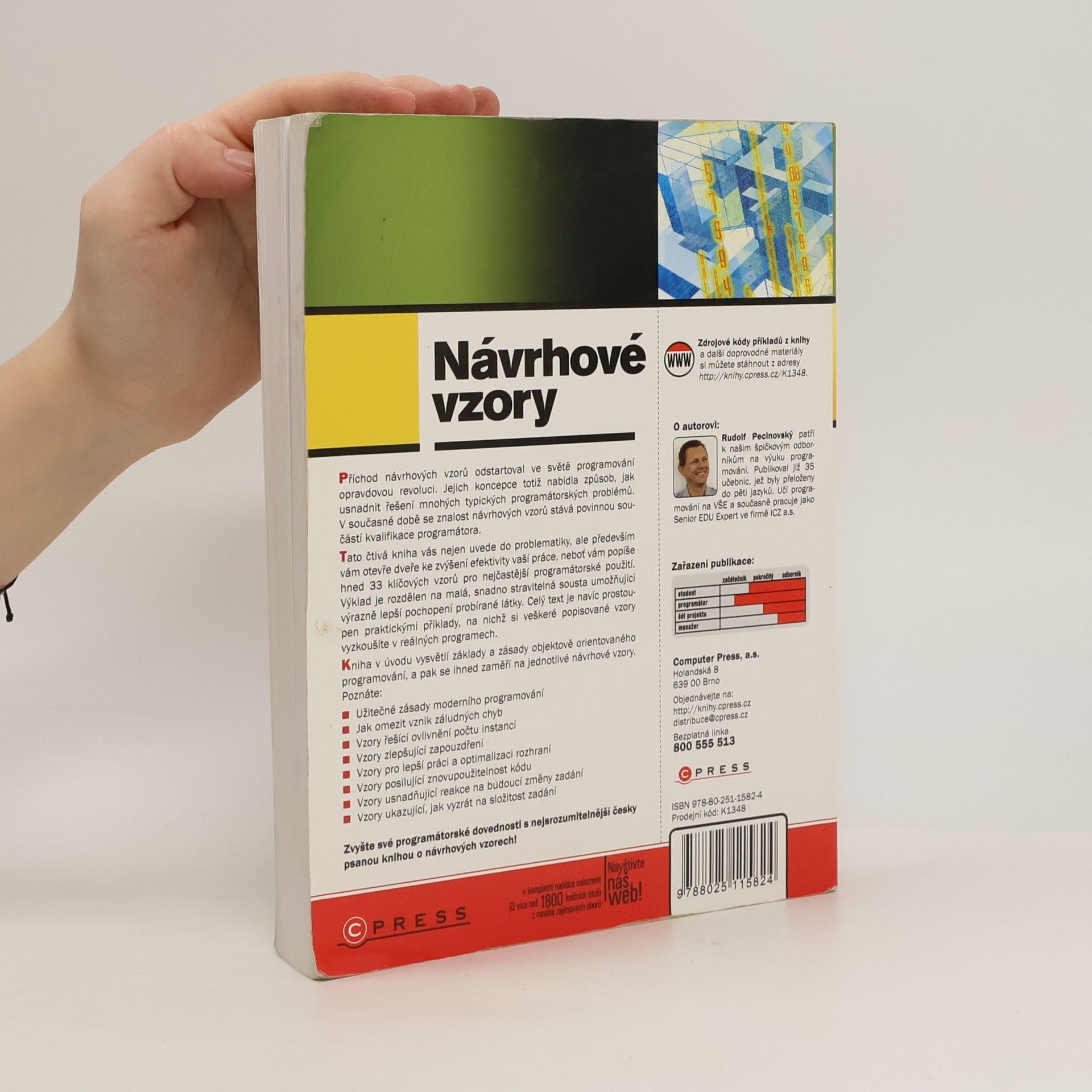 Příchod návrhových vzorů způsobil revoluci v programování, přičemž jejich koncepce usnadňuje řešení mnoha typických problémů. Znalost těchto vzorů se stává nezbytnou součástí kvalifikace programátora. Tato čtivá kniha vás uvede do problematiky a otevře vám dveře ke zvýšení efektivity práce, popisuje 33 klíčových vzorů pro běžné použití. Výklad je rozdělen na malé, snadno stravitelné části, což usnadňuje pochopení. Text je prostoupen praktickými příklady, které si vyzkoušíte v reálných programech. Na začátku knihy se vysvětlují základy a zásady objektově orientovaného programování, poté se zaměřuje na jednotlivé návrhové vzory. Poznáte užitečné zásady moderního programování, jak omezit vznik chyb, vzory řešící počet instancí, vzory zlepšující zapouzdření a optimalizaci rozhraní. Dále se seznámíte se vzory posilujícími znovupoužitelnost kódu a usnadňujícími reakce na budoucí změny zadání, stejně jako vzory, které pomáhají zvládnout složitost úkolů. Zvyšte své programátorské dovednosti s touto srozumitelnou knihou o návrhových vzorech! Zdrojové kódy příkladů a další materiály jsou dostupné na http://knihy.cpress.cz/K1348. Autor, Rudolf Pecinovský, je odborník na výuku programování, publikoval 35 učebnic a učí na VŠE, zároveň pracuje jako Senior EDU Expert ve firmě ICZ a.s.