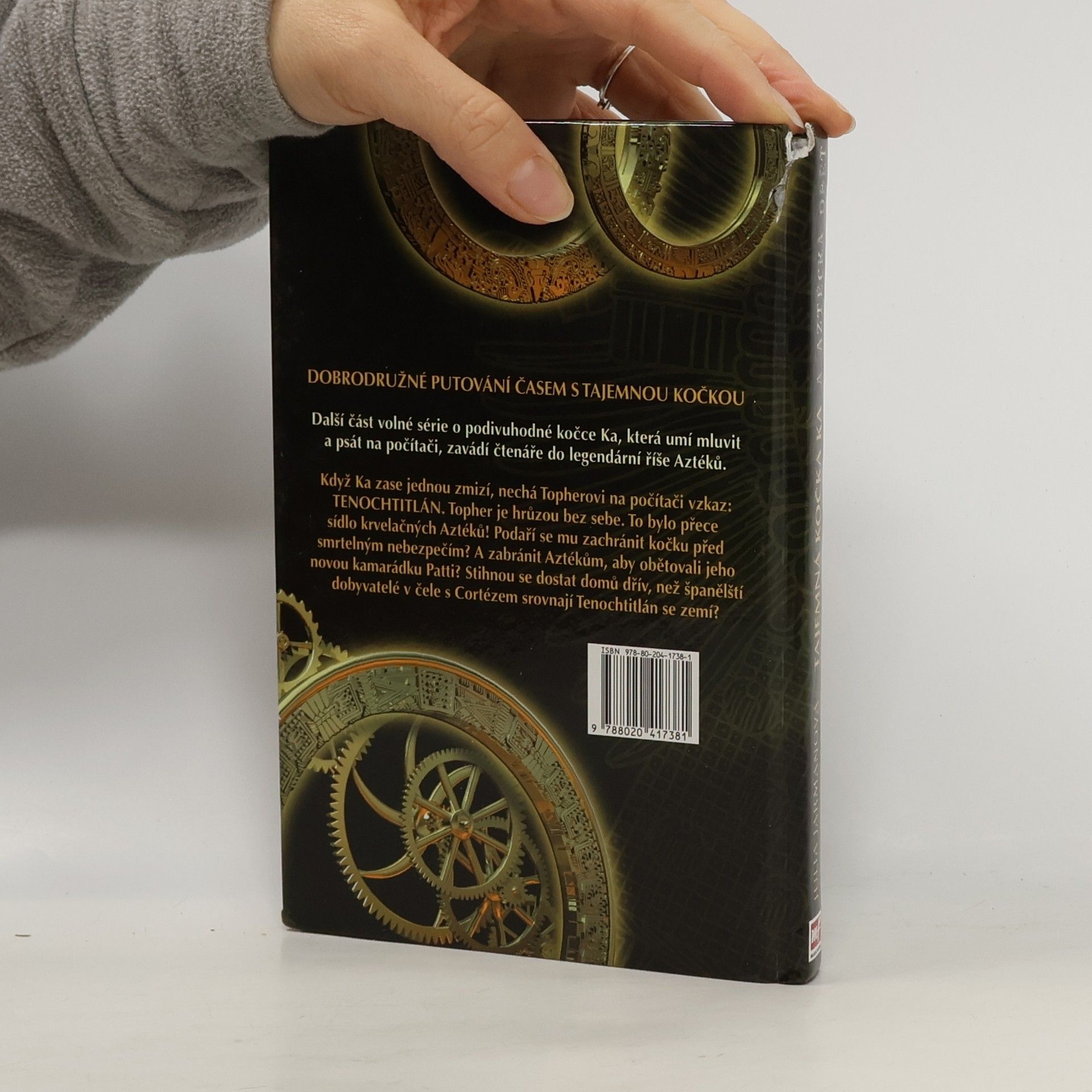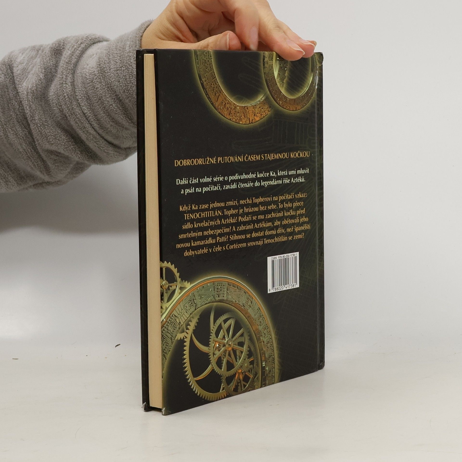 Když Ka zase jednou zmizí, nechá Topherovi na počítači vzkaz: TENOCHTITLÁN. Topher je hrůzou bez sebe. To bylo přece sídlo krvelačných Aztéků! Podaří se mu zachránit kočku před smrtelným nebezpečím? A zabránit Aztékům, aby obětovali jeho novou kamarádku Patti? Stihnou se dostat domů dřív, než španělští dobyvatelé v čele s Cortézem srovnají Tenochtitlán se zemí?