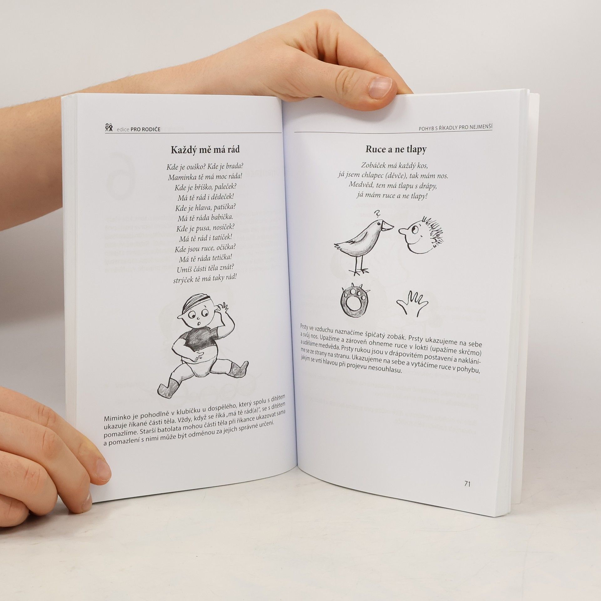 Již v prenatálním období můžeme u dětí pozorovat pohybové aktivity, které se po narození dále rozvíjejí. Přinášíme vám proto knihu plnou námětů, říkanek a praktických ukázek, jak vést své ratolesti zajímavou formou k pohybu již od útlého věku. Ptáte se, jaký mají říkanky vliv na rozvoj pohybových vlastností? Význam říkanek není pouze v tom, že je s nimi cvičení pro děti veselejší, ale i ve velkém vlivu na psychický vývoj dítěte. Děti se díky nim učí snáze mluvit a osvojí si rytmus řeči, který je tak potřebný pro získávání školních dovedností, zejména psaní a čtení. Doufáme, že se vám říkanky budou líbit a přejeme vám mnoho úspěchů při cvičení s vašimi dětmi.
