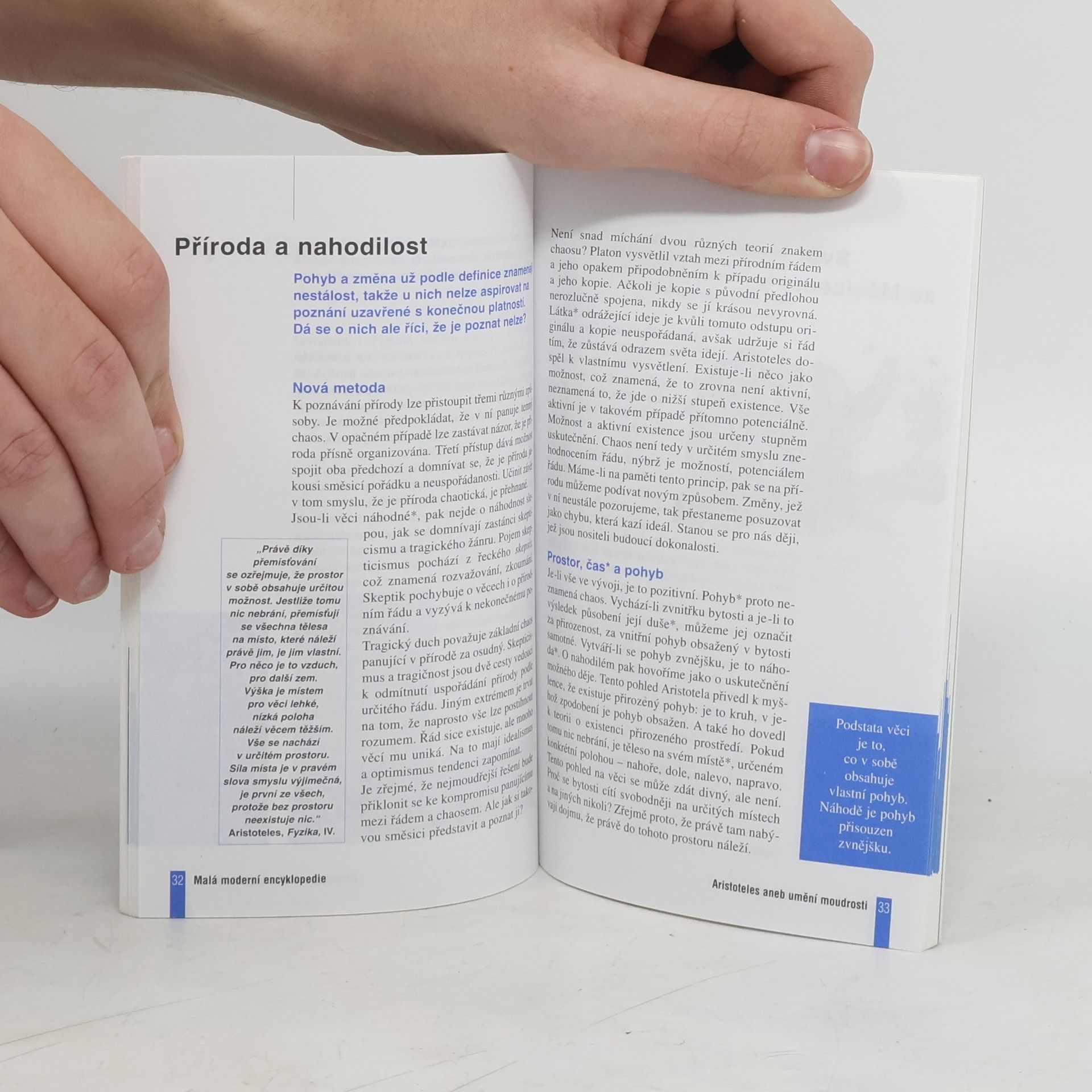 Edice Malá moderní encyklopedie - MME. V 5. stol. př. n. l. se Řecko stalo kolébkou nové kultury. Lidé se přestali opírat výhradně o náboženskou tradici, objevili sílu myšlení a začali mu důvěřovat i při řízení záležitostí obce. Platon podřizoval skutečnost ideám, a založil tím idealismus, Aristoteles podřídil naopak ideje skutečnosti, a dal tím základ realismu. Kniha provede čtenáře základy aristotelovského myšlení.