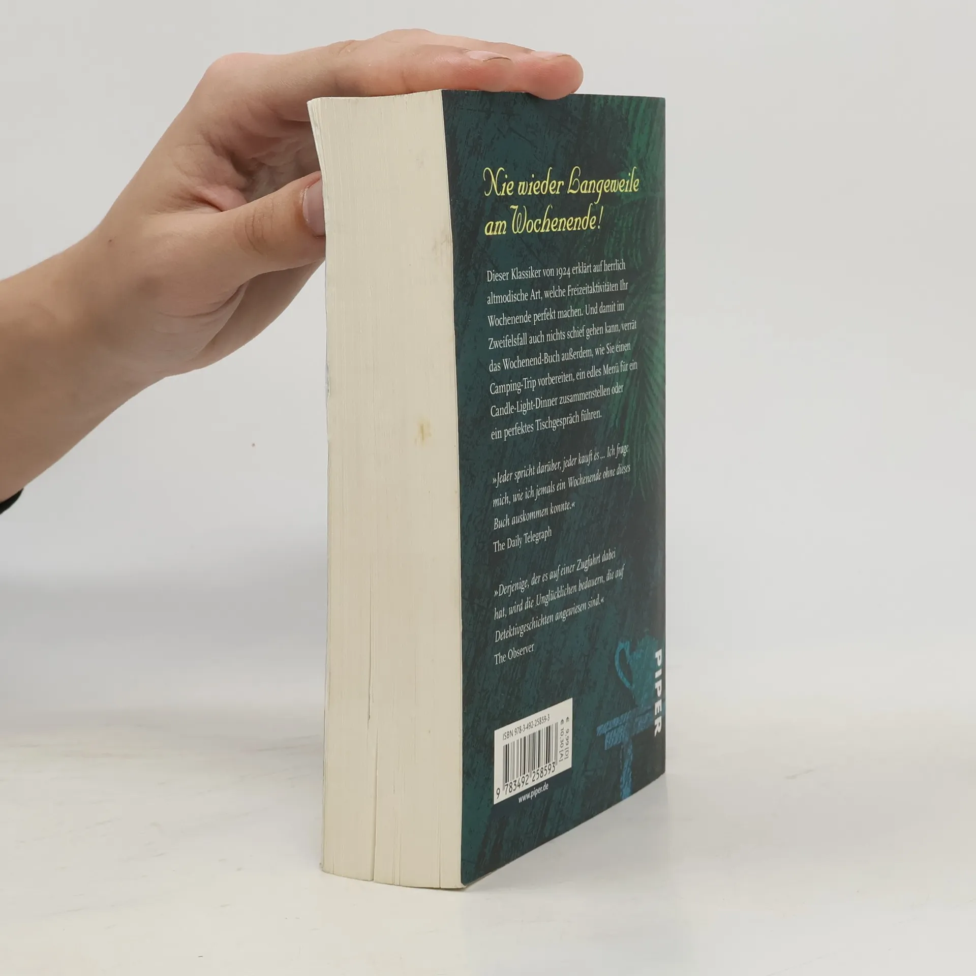 Dieser Klassiker von 1924 erklärt auf herrlich altmodische Art, welche Freizeitaktivitäten Ihr Wochenende perfekt machen. Und damit im Zweifelsfall auch nichts schiefgehen kann, verrät das 'Wochenend-Buch', wie sie einen Campingstrip vorbereiten, ein edles Menü für ein Candle-Light-Dinner zusammenstellen oder ein perfektes Tischgespräch führen.