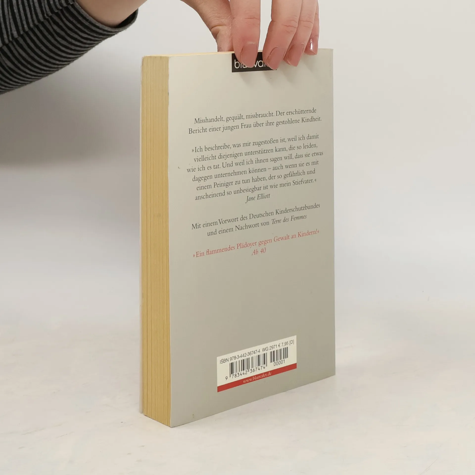 Misshandelt, gequält, missbraucht: Der erschütternde Bericht einer jungen Frau über ihre gestohlene Kindheit Jane Elliott war vier Jahre alt, als ihr Stiefvater begann, sie zu quälen, zu misshandeln und schließlich sexuell zu missbrauchen. 17 Jahre lang war sie der Brutalität dieses Mannes ausgeliefert, ohne dass ihre Mutter, ihre Brüder, Lehrer, Nachbarn oder Behörden ihr beistehen wollten. Mit 21 Jahren fand sie endlich die Kraft, sich gegen ihren Peiniger zu stellen. Sie verklagte ihren Stiefvater, der schließlich in einem Aufsehen erregenden Prozess zu 15 Jahren Gefängnis verurteilt wurde.