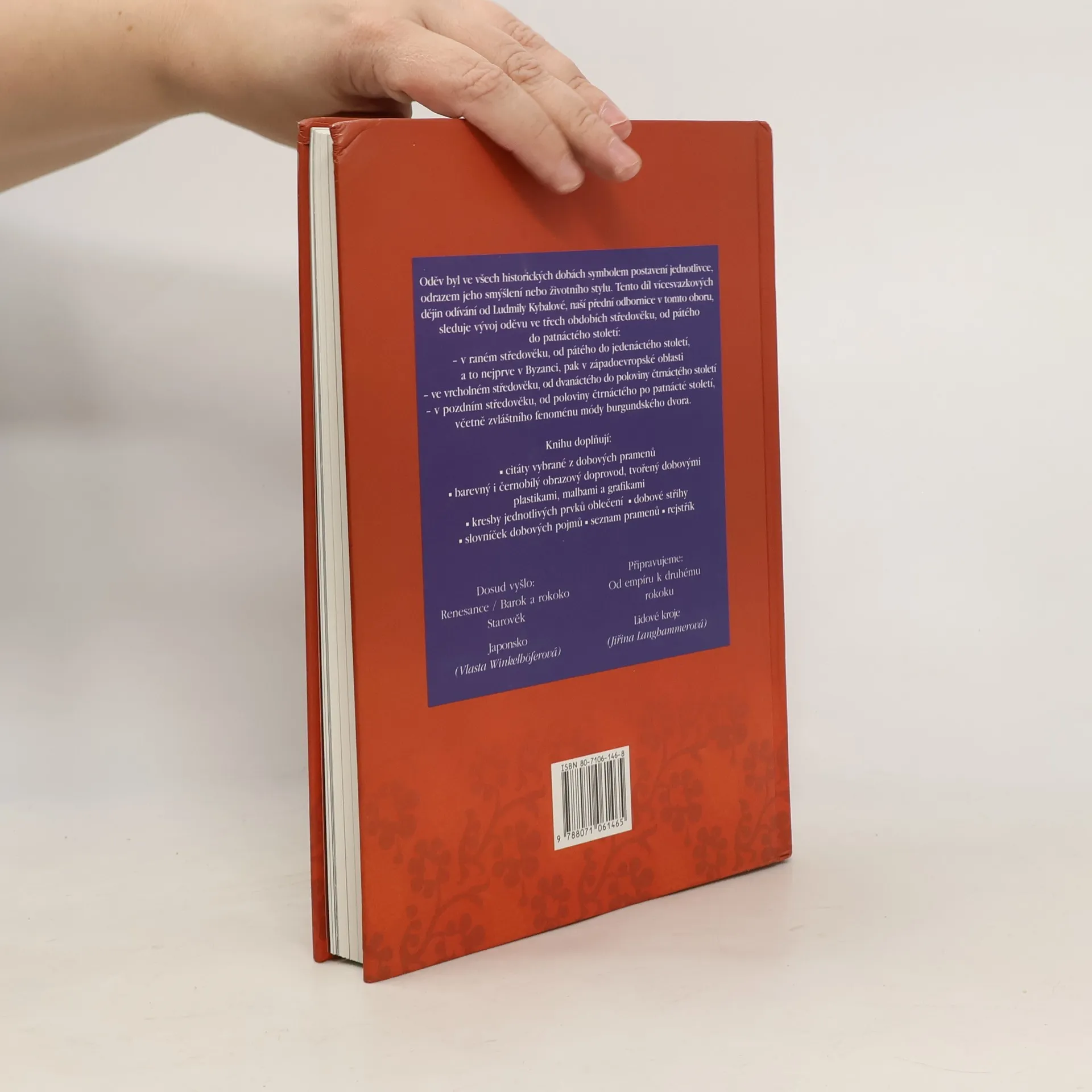 Oděv byl ve všech historických dobách symbolem postavení jednotlivce, odrazem jeho smýšlení nebo životního stylu. Tento díl vícesvazkových dějin odívání sleduje vývoj oděvu ve třech obdobích středověku, od pátého do patnáctého století: - v raném středověku, od pátého do jedenáctého století, a to nejprve v Byzanci, pak v západoevropské oblasti -ve vrcholném středověku, od dvanáctého do poloviny čtrnáctého století - v pozdním středověku, od poloviny čtrnáctého století po patnácté století, včetně zvláštního fenoménu módy burgunského dvora. Knihu doplňují citáty vybrané z dobových pramenů, barevný i černobílý obrazový doprovod tvořený dobovými malbami a grafikami, kresby jednotlivých prvků oblečení, dobové střihy i slovníček dobových pojmů ze slovníku odívání.