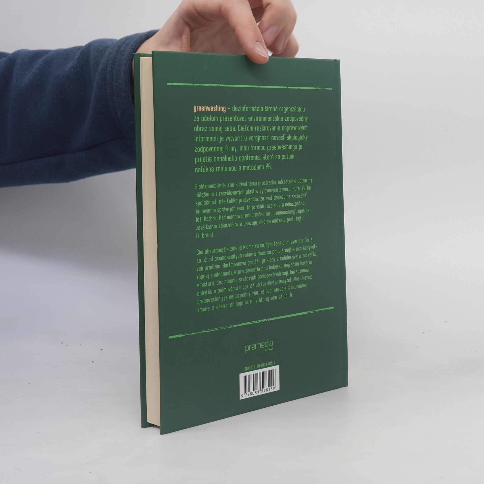 Elektromobily šetrné k životnému prostrediu, udržateľné potraviny, oblečenie z recyklovaných plastov vylovených z mora. Hurá! Veľké spoločnosti nás ľahko presvedčia, že svet dokážeme zachrániť kupovaním správnych vecí. To je však rozsiahla a nebezpečná lož. Katharin Hartmannová, odborníčka na „greenwashing“, opisuje zavádzanie zákazníkov a ukazuje, ako sa môžeme proti tejto lži brániť. Čím absurdnejšie zelené klamstvá sú, tým ľahšie im uveríme. Šíria sa už od osemdesiatych rokov a dnes sú populárnejšie ako kedykoľvek predtým. Hartmannová prináša príklady z celého sveta, od veľkej ropnej spoločnosti, ktorá zamietla pod koberec najväčšiu haváriu v histórii, cez ničenie svetových pralesov kvôli sóji, hovädziemu dobytku a palmovému oleju, až po textilný priemysel. Ako ukazuje, greenwashing je nebezpečný tým, že ľudí nevedie k skutočnej zmene, a tým len prehlbuje krízu, v ktorej sme sa ocitli.