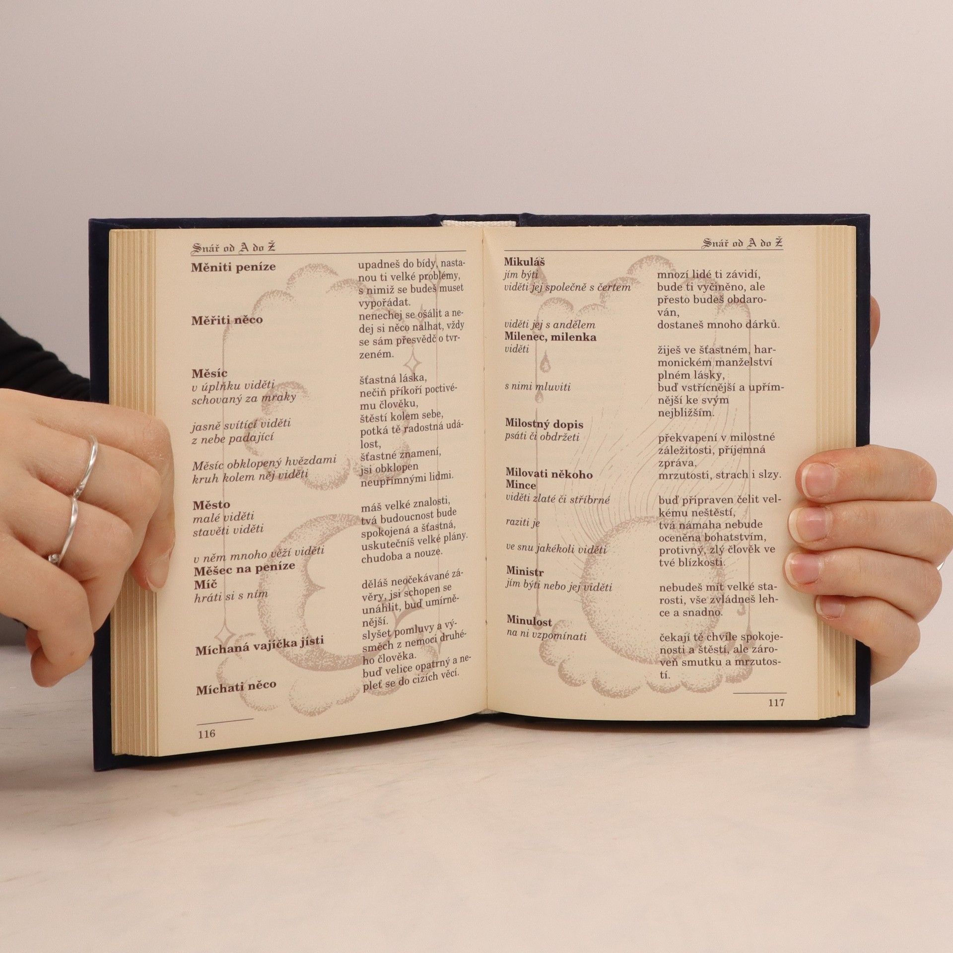 Malý praktický snář v abecedním uspořádání. Celostránkové ilustrace jsou podloženy pod textem, text i ilustrace v barvě hnědé. Vázaná, rozměr 102 x 145 dárkové provedení – mikroplyš neboli broušený samet barvy modré, se stříbroražbou a prokládaným hřbetem.