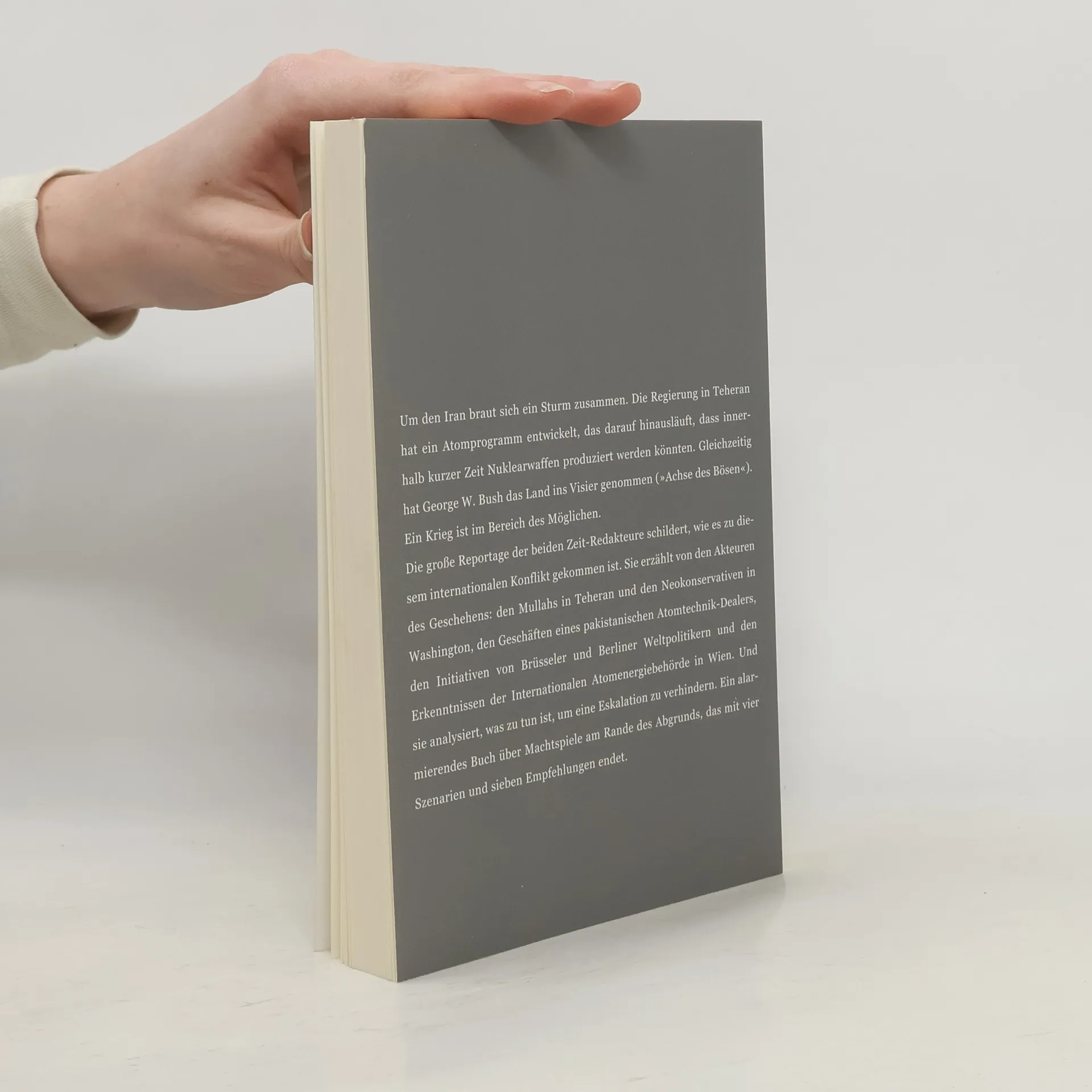 Iran auf dem Weg zur Nuklearmacht? Eine Strategie, die nicht Wirklichkeit werden darf. Aber wie lässt sie sich stoppen? Text(Klappentext o.ä.) Deutsch Ein Report über die Mullahs in Teheran und den einsamen Riesen Iran, über die Neokonservativen in Washington, über Brüsseler und Berliner Weltpolitiker und die Verantwortlichen der Atomüberwachungsbehörde in Wien - und über die Rolle, die all diese Akteure bei der Entstehung eines sich zuspitzenden Weltkonflikts spielen. Das Buch endet mit drei Szenarien und drei Empfehlungen. Um den Iran braut sich ein Sturm zusammen, Die Regierung in Teheran hat ein Atomprogramm entwickelt, das darauf hinausläuft, dass innerhalb kurzer Zeit Nuklearwaffen produziert werden könnten. Gleichzeitig hat George W. Bush das Land im Visier („Achse des Bösen“). Ein Krieg ist im Bereich des Möglichen. Die Reportage der beiden Zeit-Journalisten schildert, wie es zu diesem internationalen Konflikt gekommen ist, erzählt von den Protagnisten des Geschehens und analysiert, was zu tun ist, um eine Eskalation zu verhindern. Ein alarmierendes Buch über Machtspiele am Rande des Abgrunds.