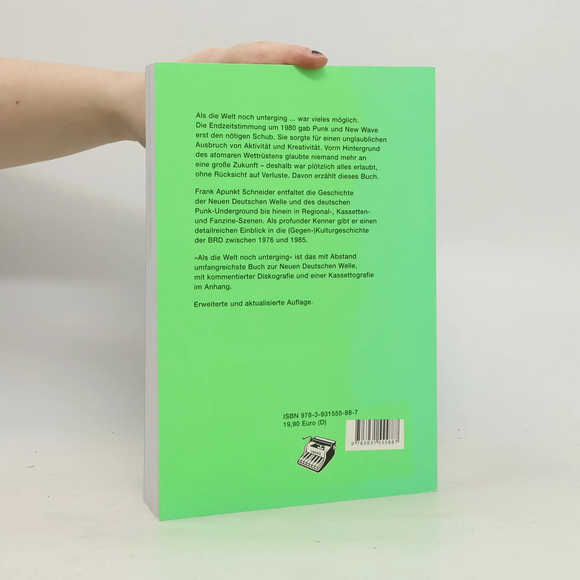 Eine Chronik zur Entstehung und Entwicklung von Punk und New Wave im deutschsprachigen Raum bis 1985. Als die Welt noch unterging. war vieles möglich. Die Endzeitstimmung um 1980 gab Punk und New Wave erst den nötigen Schub. Sie sorgte für einen unglaublichen Ausbruch von Aktivität und Kreativität. Vorm Hintergrund des atomaren Wettrüstens glaubte niemand mehr an eine große Zukunft - deshalb war plötzlich alles erlaubt, ohne Rücksicht auf Verluste. Davon erzählt dieses Buch. Frank Apunkt Schneider entfaltet die Geschichte der Neuen Deutschen Welle und des deutschen Punk-Underground bis hinein in Regional-, Kassetten- und Fanzine-Szenen. Neben den mittlerweile kanonisierten Klassikern dieser Bewegung, (z. B. DAF, Fehlfarben) rückt er sowohl Chartbreaker wie Trio oder Extrabreit als auch Underground-Acts wie Kosmonautentraum, Familie Hesselbach etc. in den Fokus. „Als die Welt noch unterging“ ist das mit Abstand umfangreichste Buch zur Neuen Deutschen Welle. Mit kommentierter Diskografie und einer Kassettografie im Anhang, die für die neue Auflage zusätzlich erweitert wurden.