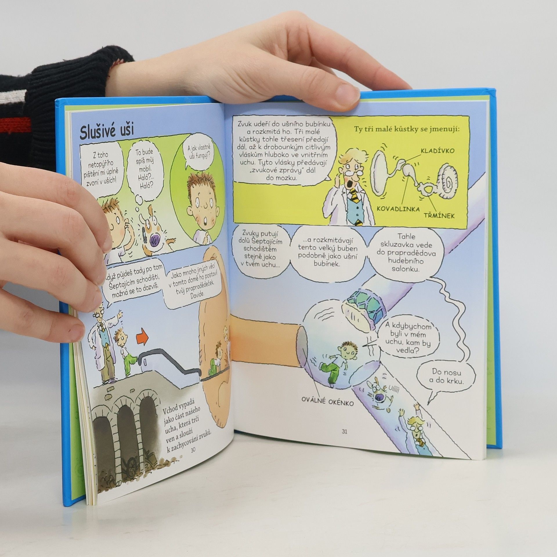 Vítejte v kouzelném Davidově domě, kde se může stát cokoli (a taky se to často stane). Kromě Davida a jeho žravého psa Moulíka se tu setkáte s panem Očkem (vševědoucím správcem domu), nápaditým vynálezcem Koumesem či Kubou Kutílkem, specialistou na převleky. V Lidském těle si budete moci přečíst, kde máte v těle kladívko, kovadlinku a třmínek, jak dlouhá máte střeva či jak rychle umíte kýchat.