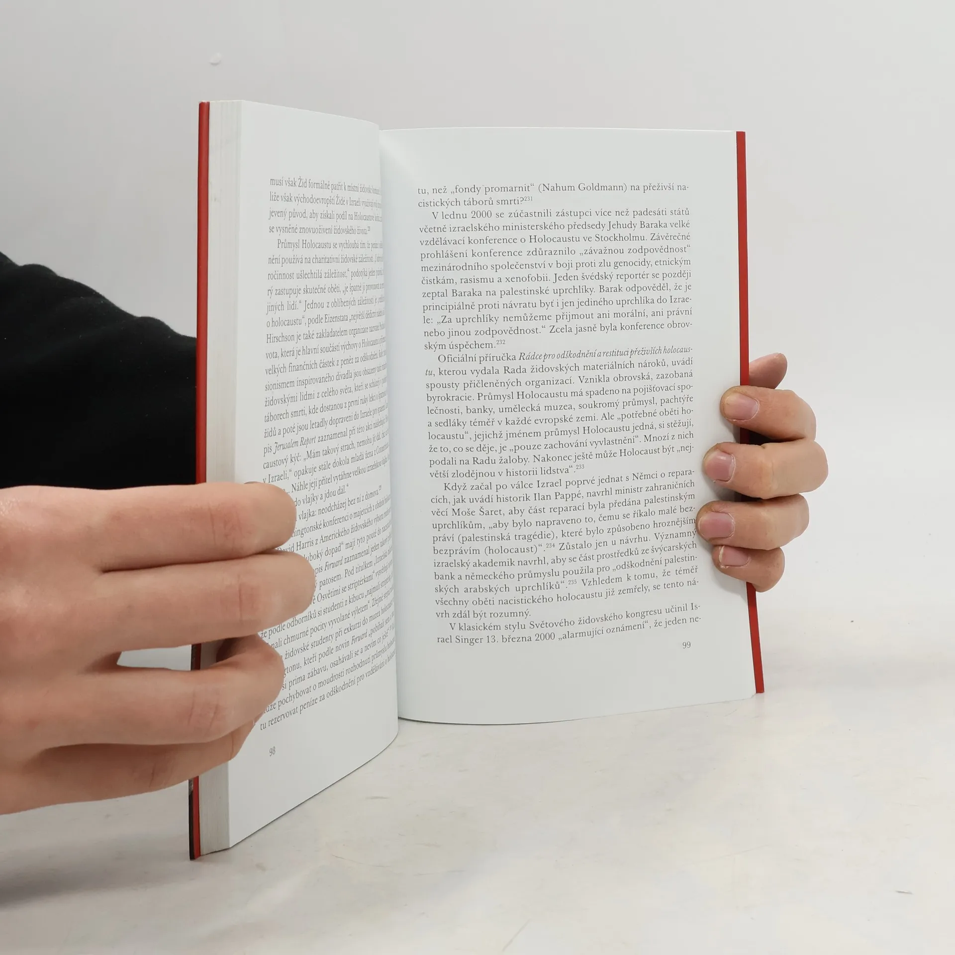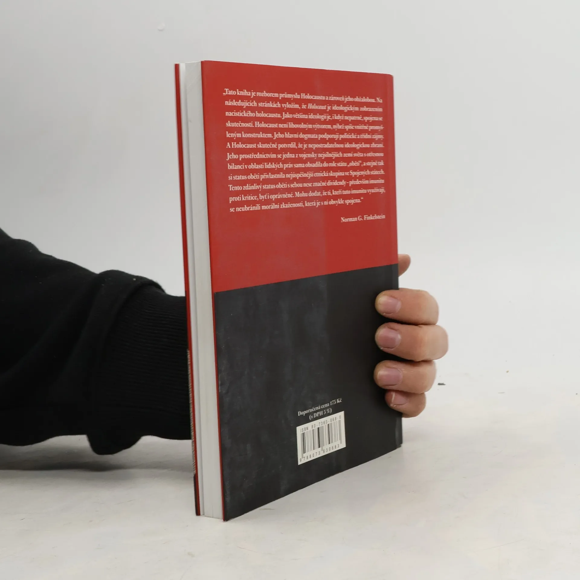 Podtitul: Úvahy o zneužívání židovského utrpení Americký politolog kritizuje současný trend mocenského zneužívání utrpení židovského obyvatelstva za 2.světové války. V současnosti se holocaust stal nepostradatelnou ideologickou zbraní pro určité izraelské a židovské kruhy. Podle autora se tezí o historické výjimečnosti holocaustu Izrael, jedna z vojensky nejsilnějších zemí světa s otřesnou bilancí v oblasti lidských práv, obsadil do role permanentní oběti a stejný status si přivlastnila i nejúspěšnější etnická skupina ve Spojených státech. Hlavní motivy k oživování této historické události Finkelstein odhaluje dva. Na straně jedné si židovské organizace díky umělému udržování problematiky holocaustu neustále nárokují od určitých států finanční odškodnění. Druhým motivem je ospravedlňování zahraniční politiky Izraele, který se díky historické genocidě snaží na věčné časy stylizovat do role "státu-oběti"...