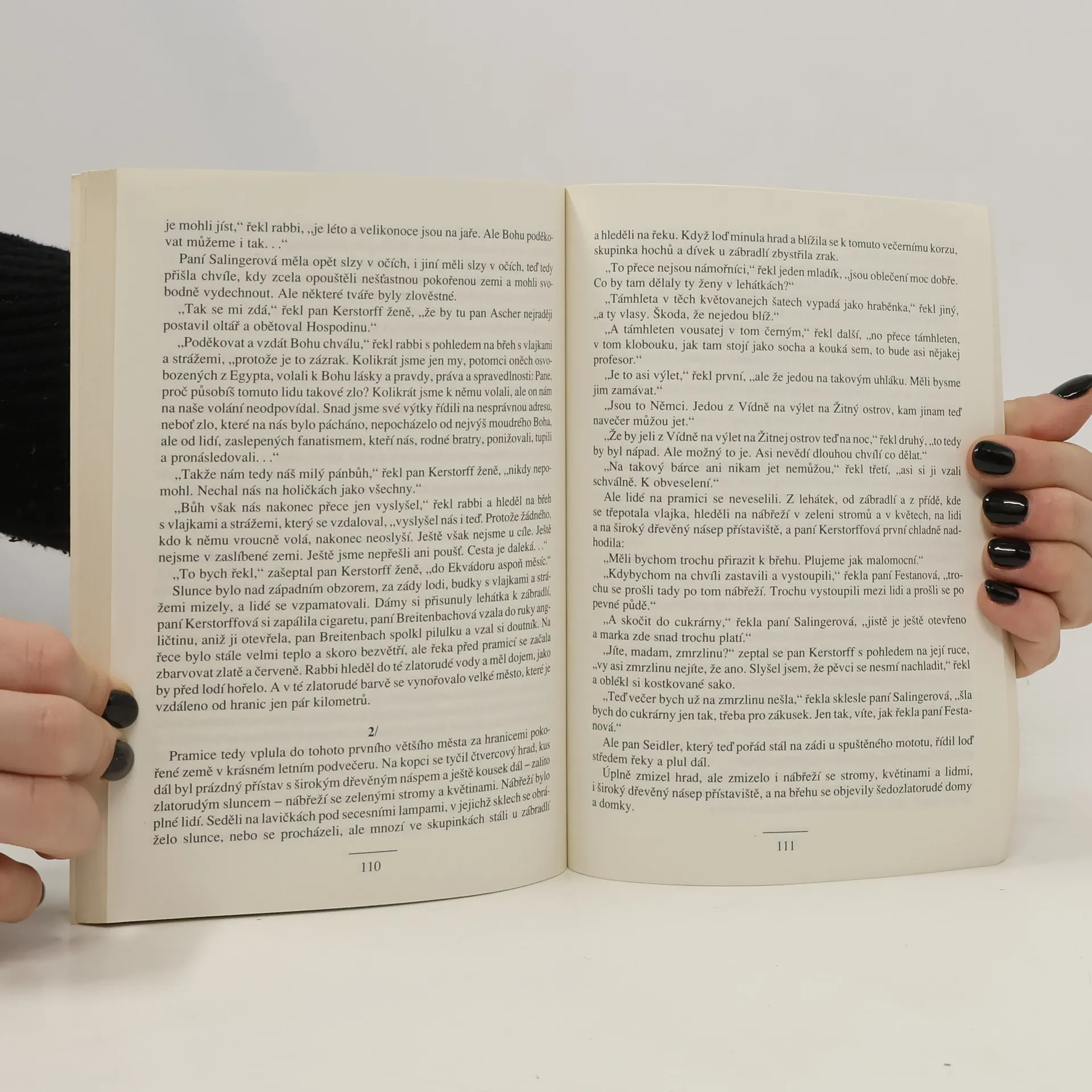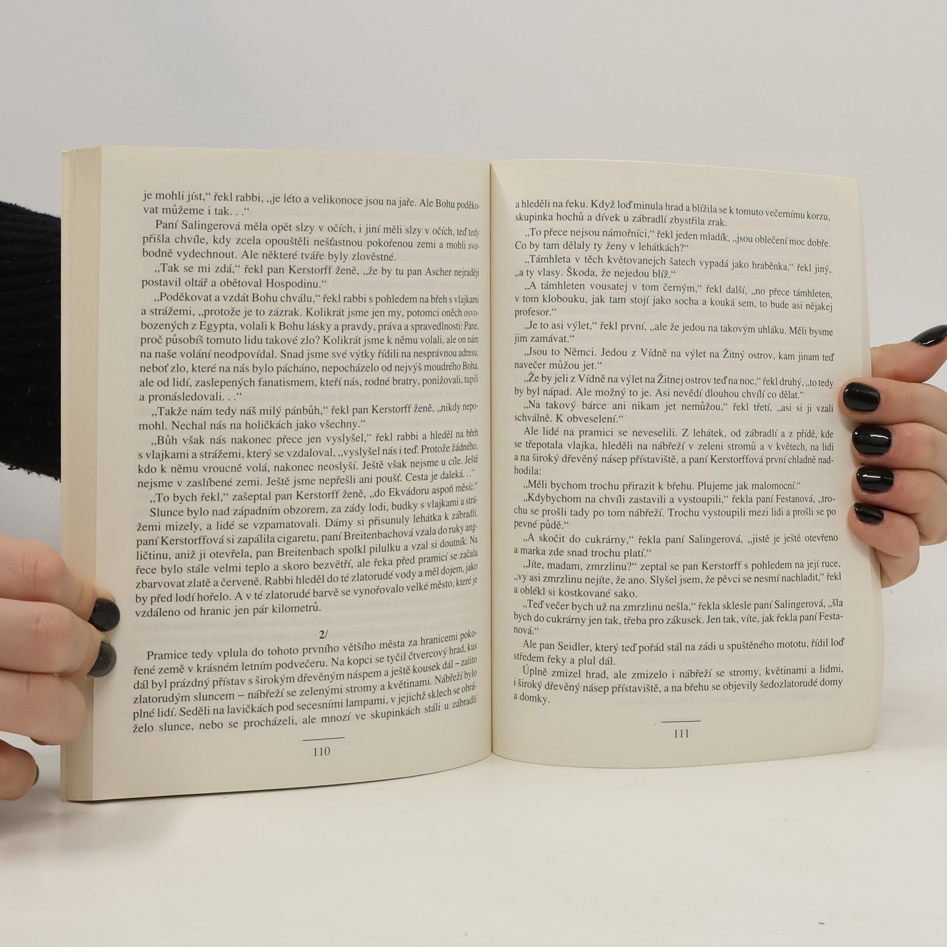 Strhující příběh o patnácti bohatých vídeňských Židech, kterým je po anšlusu "dovoleno" emigrovat po Dunaji na vratké kocábce. "Nemáte průjezdní víza, loď nesmí nikde přistát..." Nejprve si cestu užívají, ale pak dojde k poruše motoru. Třikrát se pokoušejí s lodí s hákovým křížem přistát, třikrát jsou zahnáni zpět na řeku. Přistanou na liduprázdném slovenském břehu, opraví závadu ale mezitím klesne voda a loď je na suchu, nemají sílu ji dostat k vodě, hledají řeku, postupně ztrácí veškerou naději. Zbytky trosečníků nalezne slovenský kněz, přesvědčuje je ....aby se pokusili, nevdzali, zachránili .... Rabbi říká: Pořád někdo někoho pronásleduje a bere volnost, pořád někdo někoho viní, štve a bere mu život. Pořád někdo utlačuje jiné ve jménu pravdy....pořád někdo někomu brání jíst, spát, bydlet, hledat štěstí a žít. A Židé na to od počátku dopláceli nejvíc. Proto volají šalom, mír vzdáleným i blízkým, mír všem. Cesta do zaslíbené země vede už jen vzhůru. V den, kdy začala válka, volí dobrovolně smrt. Představuje vrchol Fuksovy povídkové tvorby. Motivem, kdy se ze ctihodných, slušných lidí během krizové situace velmi rychle stanou špinavé a jakékoli akce neschopné trosky, může poněkud připomínat Goldingova Pána much. ... celý text