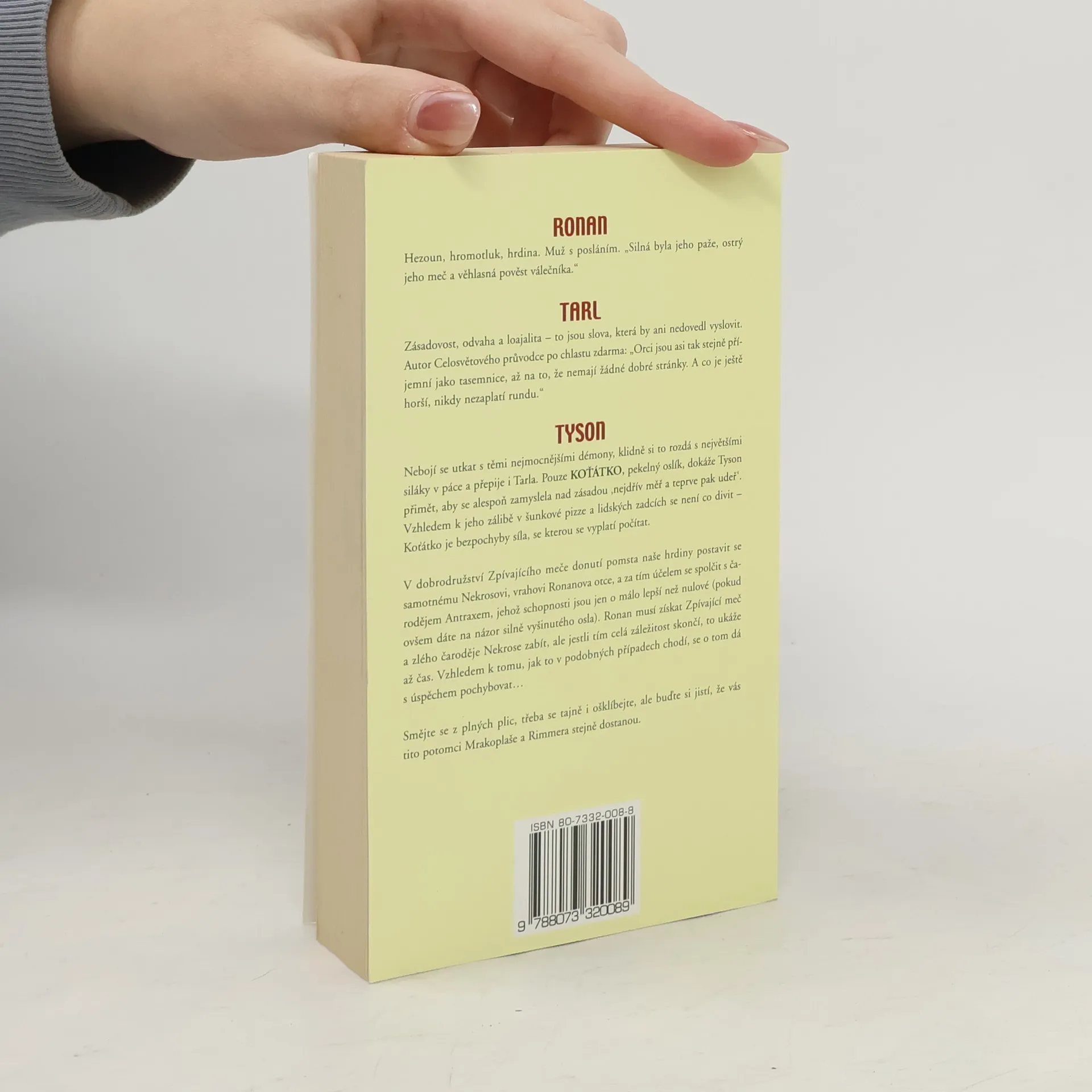 Ronan – Hezoun, hromotluk, hrdina. Muž s posláním. „Silná byla jeho paže, ostrý jeho meč a věhlasná pověst válečníka.“ Tarl – Zásadovost, odvaha a loajalita – to jsou slova, která by ani nedovedl vyslovit. Autor Celosvětového průvodce po chlastu zdarma: „Orci jsou asi tak stejně příjemní jako tasemnice, až na to, že nemají žádné dobré stránky. A co je ještě horší, nikdy nezaplatí rundu.“ Tyson – Nebojí se utkat s těmi nejmocnějšími démony, klidně si to rozdá s největšími siláky v páce a přepije i Tarla. Pouze Koťátko, pekelný oslík, dokáže Tyson přimět, aby se alespoň zamyslela nad zásadou ,nejdřív měř a teprve pak udeř'. Vzhledem k jeho zálibě v šunkové pizze a lidských zadnicích se není co divit – Koťátko je bezpochyby síla, se kterou se vyplatí počítat. V dobrodružství Zpívajícího meče donutí pomsta naše hrdiny postavit se samotnému Nekrosovi, vrahovi Ronanova otce, a za tím účelem se spolčit s čarodějem Antraxem, jehož schopnosti jsou jen o málo lepší než nulové (pokud ovšem dáte na názor silně vyšinutého osla). Ronan musí získat Zpívající meč a zlého čaroděje Nekrose zabít, ale jestli tím celá záležitost skončí, to ukáže až čas. Vzhledem k tomu, jak to v podobných případech chodí, se o tom dá s úspěchem pochybovat...