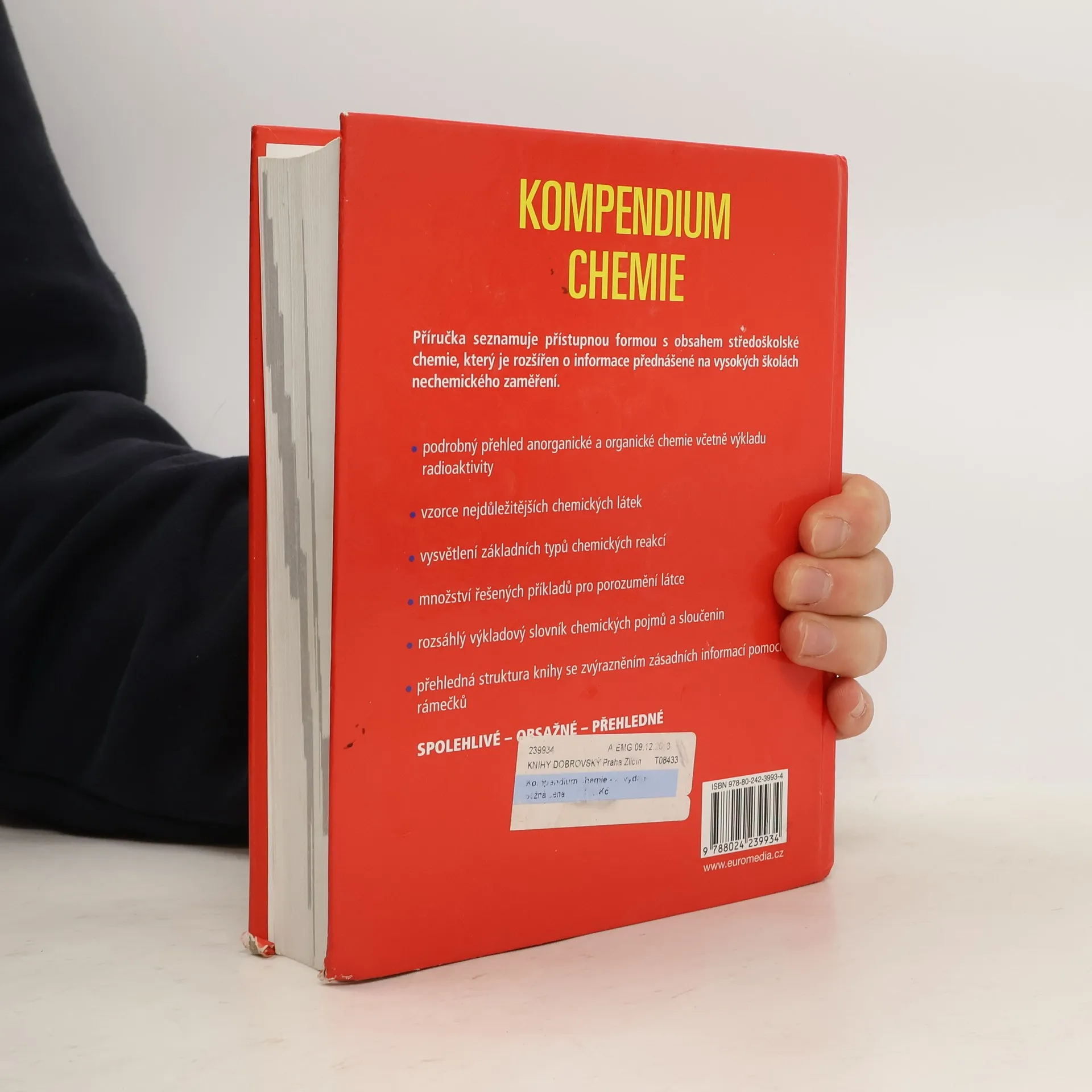 Příručka navazuje na úspěšnou publikaci Kompendium matematiky. Přístupnou formou seznamuje s obsahem středoškolské chemie, který je doplněn o rozšiřující informace přednášené na vysokých školách nechemického zaměření. Obsahuje podrobný přehled anorganické a organické chemie včetně výkladu radioaktivity, vzorce nejdůležitějších chemických látek a vysvětlení základních typů chemických reakcí. Je doplněna řešenými poříklady a rozsáhlým výkladovým slovníkem chemických pojmů a sloučenin.