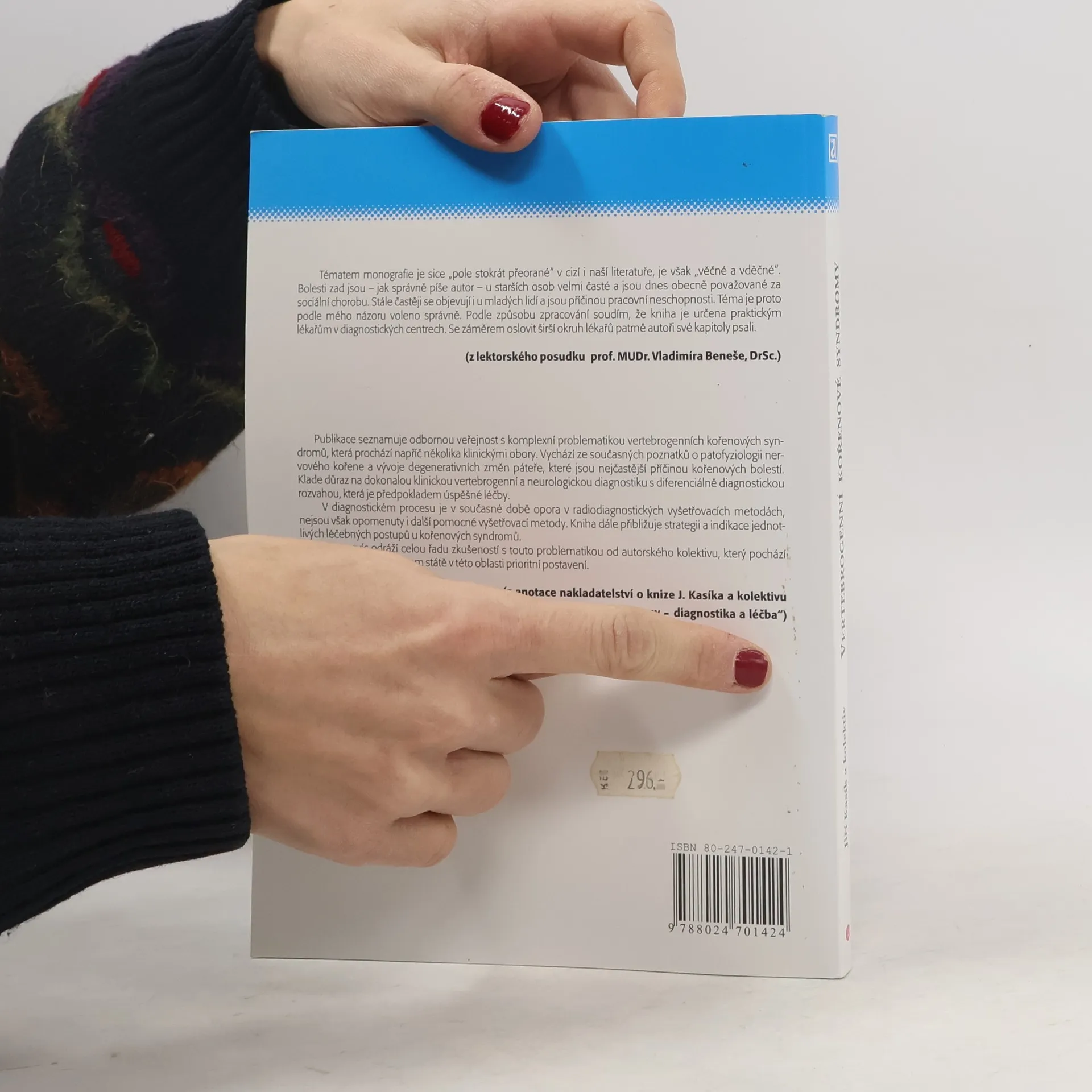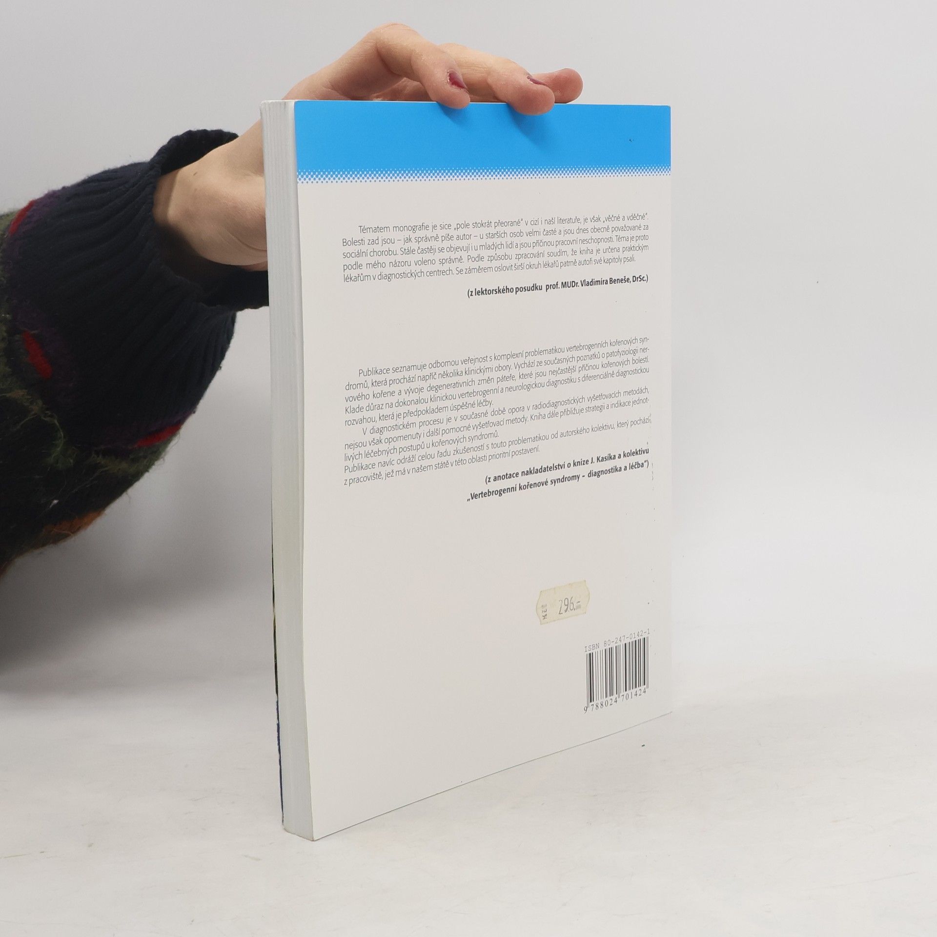 Publikace seznamuje odbornou veřejnost s komplexní problematikou vertebrogenních kořenových syndromů, která prochází napříč několika klinickými obory. Vychází ze současných poznatků o patofyziologii nervového kořene a vývoje degenerativních změn páteře, které jsou nejčastější příčinou kořenových bolestí. Klade důraz na dokonalou klinickou vertebrogenní a neurologickou diagnostiku s diferenciálně diagnostickou rozvahou, která je předpokladem úspěšné léčby. V diagnostickém procesu je v současné době opora v radiodiagnostických vyšetřovacích metodách, nejsou však opomenuty i další pomocné všetřovací metody. Kniha dále přibližuje strategii a indikace jednotlivých léčebných postupů u kořenových syndromů. Publikace navíc odráží celou řadu zkušeností s touto problematikou od autorského kolektivu, který pochází z pracoviště, jež má v našem státě v této oblasti prioritní postavení. (z anotace nakladatelství o knize J. Kasíka a kolektivu ,,Vertebrogenní kořenové syndromy - diagnostika a léčba")