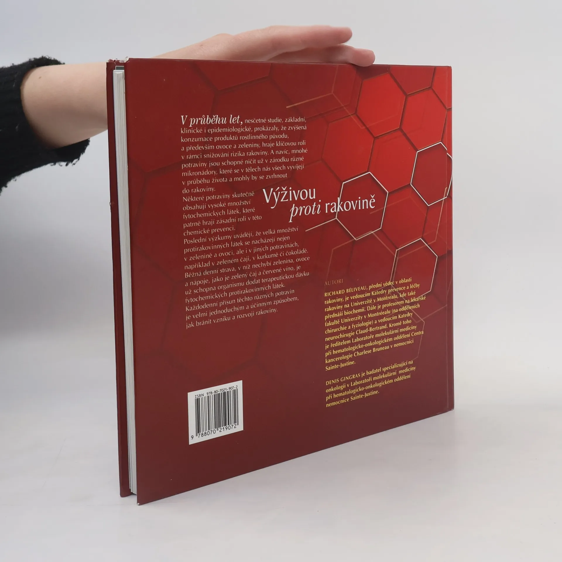 Prevence rakoviny pomocí stravy Onkologové a autoři knihy Výživou proti rakovině, Richard Béliveau a Denis Gingras dávají návod jak účinně vhodně zvolenou stravou zabránit vzniku a postupu rakoviny. V době, kdy se rakovina stala celosvětovým „strašákem“, přicházejí dva onkologové z kanadského Québecu s návodem, jak se proti této zhoubné nemoci chránit správnou výživou. Úvodní kapitoly jsou věnovány stručné charakteristice rakoviny, jejím příčinám, vývoji a léčbě. Hlavní část knihy se zabývá otázkou, jakou roli hraje v tomto procesu strava, zejména pak potravinami, které tuto nemoc zpomalují či dokážou její postup zastavit. Nejnovější výzkumy ukazují, že kromě ovoce a zeleniny i další potraviny jako zelený čaj, červené víno nebo čokoláda obsahují protirakovinné složky. Každodenní vhodně zvolená strava tedy může působit terapeuticky – výživa se tak může stát prostým, ale účinným prostředkem proti vzniku a postupu rakoviny. Závěrečná kapitola obsahuje soubor praktických rad pro nemocné a vyvrací některé „potravinové mýty“. Nákladně vypravená publikace obsahuje velké množství barevných obrázků, diagramů a grafů.