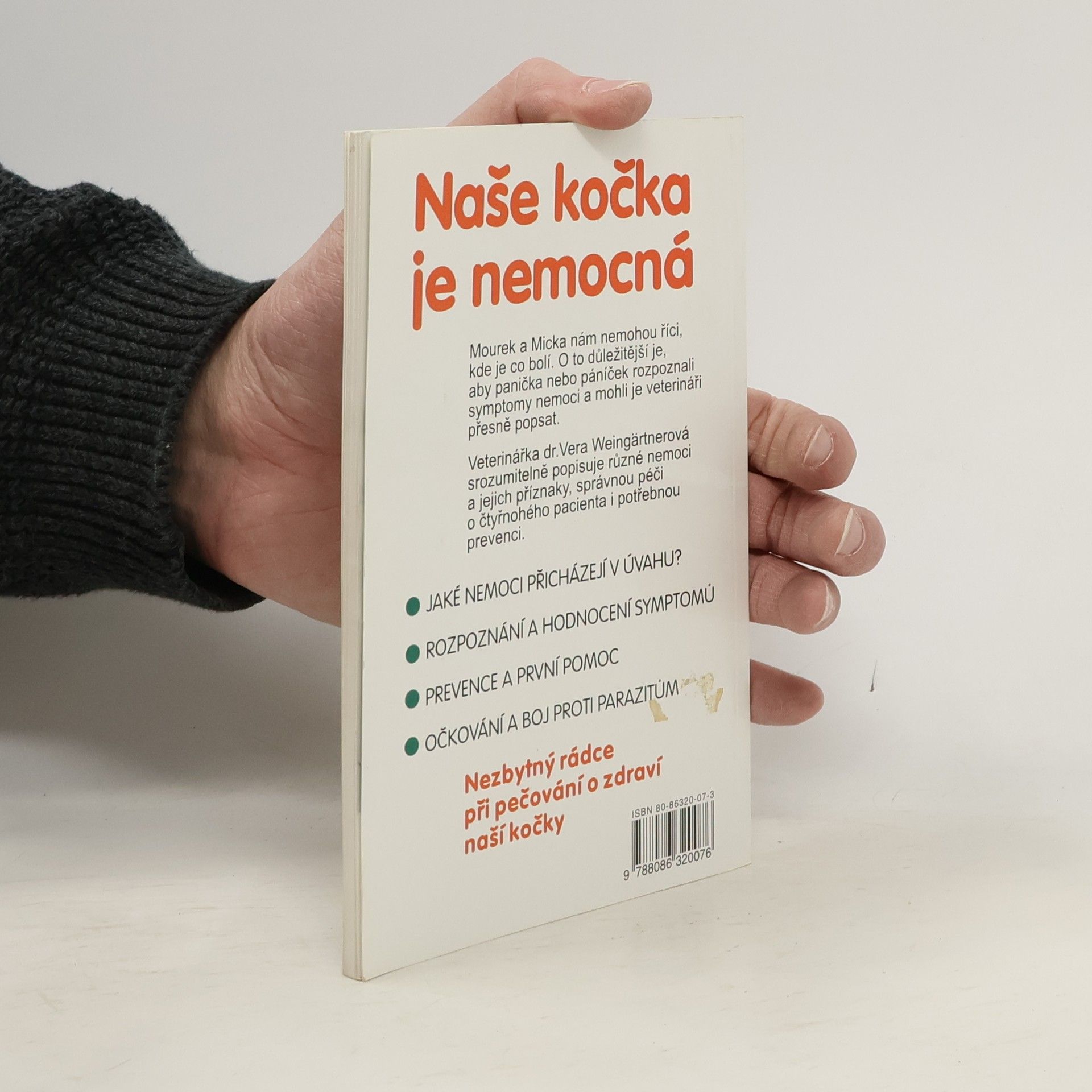 Podtitul: Prevence, rozpoznání nemocí, pomoc Kniha je věnována správnému rozpoznání symptomů při onemocnění kočky, prevenci chorob a popisu možných nemocí. Příručka pomáhá rozpoznat rizika a příznaky onemocnění, uvádí infekčí choroby a nemoci orgánů. První pomoci při onemocnění zvířete je věnována jen malá pozornost.