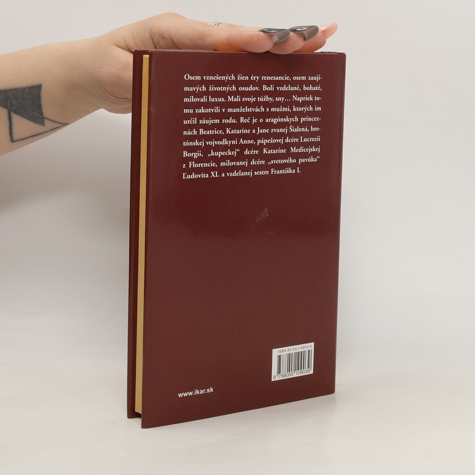 Osem vznešených žien éry renesancie, osem zaujímavých životných osudov. Boli vzdelané, bohaté, milovali luxus. Mali svoje túžby, sny… Napriek tomu zakotvili v manželstvách s mužmi, ktorých im určil záujem rodu. Reč je o aragónskych princeznách Beatrice, Kataríne a Jane zvanej Šialená, bretónskej vojvodkyni Anne, pápežovej dcére Lucrezii Borgii, „kupeckej“ dcére Kataríne Medicejskej z Florencie, milovanej dcére „svetového pavúka“ Ľudovíta XI. a vzdelanej sestre Františka I.