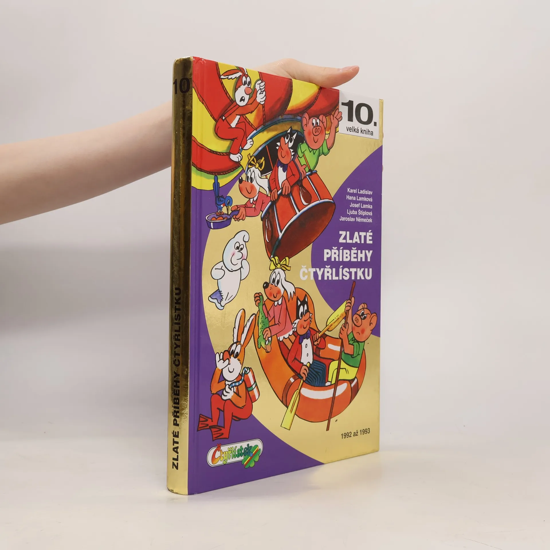 Připravili jsme desátý díl velkých souborných knih Čtyrlístku, který obsahuje příběhy z let 1992 a 1993 včetně proslulé Dvoustovky. Příběhy plynule navazují na dříve vydané. Obálka je tentokrát se zlatou ražbou, která bude na místě zde vyobrazené hnědé, tedy na 1. straně obálky a na hřbetu knihy. Vzorek zlaté ražby vám pošleme ještě zvlášť. Je velice atraktivní a přitáhne oko kupujícího.