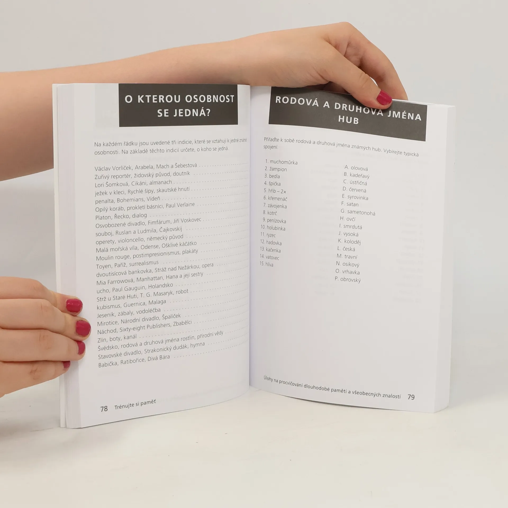 Publikace od zkušené autorky nabízí praktické návody k pravidelnému procvičování mozkové činnosti. Úkoly jsou rozděleny do jednotlivých kapitol podle toho, jaká kognitivní funkce je jimi převážně procvičována. Jde o úlohy na procvičování dlouhodobé i krátkodobé paměti, slovní zásoby, koncentrace pozornosti, prostorového plošného myšlení a představivosti, logického myšlení a myšlení v souvislostech. Kniha předkládá úlohy na různém stupni náročnosti. Správné řešení si čtenář může zkontrolovat v klíči. Knihu ocení profesionální trenéři paměti, ergoterapeuti, aktivizační pracovníci, zástupci podobných profesí v oblasti zdravotnictví a sociální péče a každý, kdo chce poznat různé paměťové techniky a uchovat si svůj mozek co nejdéle svěží.