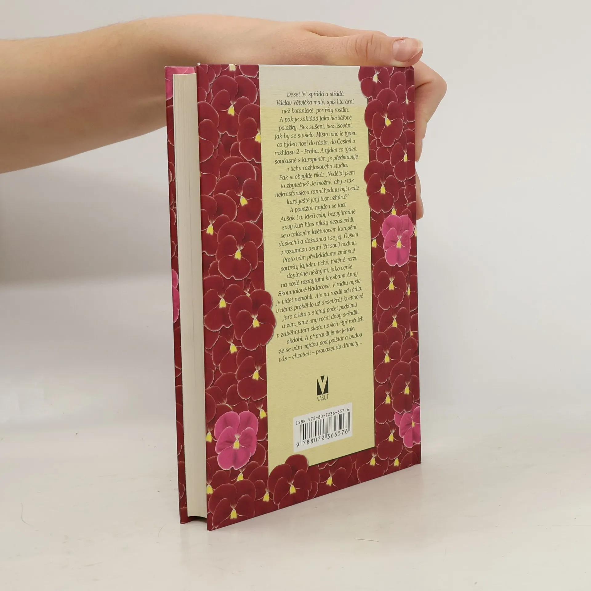 Deset let spřádá a střádá Václav Větvička malé, spíš literární než botanické, portréty rostlin. A pak je zakládá jako herbářové položky. Bez sušení, bez lisování, jak by se slušelo. Místo toho je týden co týden nosí do rádia, do Českého rozhlasu 2 - Praha. A týden co týden, současně s kuropěním, je představuje v tichu rozhlasového studia. Pak si obvykle říká: "Nedělal jsem to zbytečně? Je možné, aby v tak nekřesťanskou ranní hodinu byl vedle kurů ještě jiný tvor vzhůru?" A považte, najdou se tací. Avšak i ti, kteří coby bezvýhradné sovy kuří hlas nikdy nezaslechli, se o takovém květinovém kuropění doslechli a dožadovali se jej. Ovšem v rozumnou denní (čti soví) hodinu. Proto vám předkládáme zmíněné portréty kytek v tiché, tištěné verzi, doplněné něžnými, jako verše na vodě rozmytými kresbami Anny Skoumalové-Hadačové. V rádiu byste je vidět nemohli. Ale na rozdíl od rádia, v němž proběhlo už desetkrát květinové jaro a léto a stejný počet podzimů a zim, jsme ony roční doby seřadili v zaběhnutém sledu našich čtyř ročních období. A připravili jsme je tak, že se vám vejdou pod polštář a budou vás - chcete-li - provázet do dřímoty.