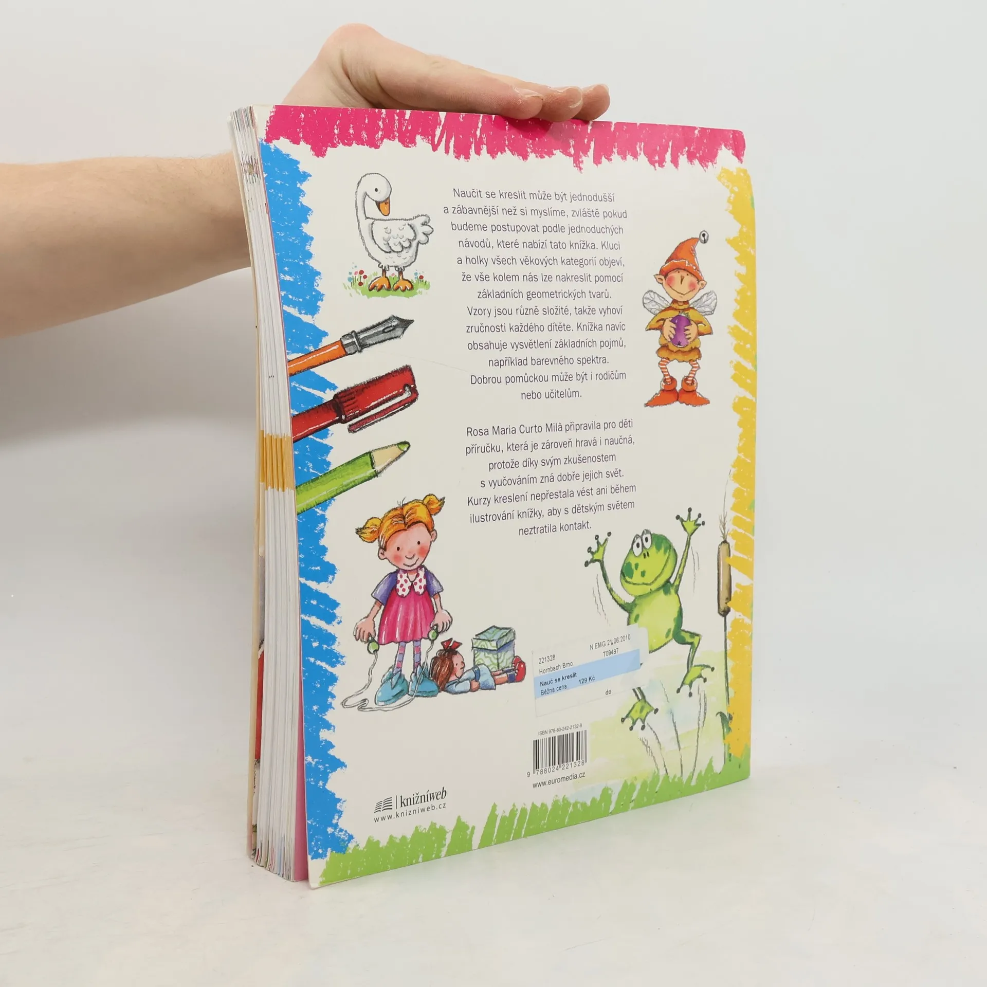 Nauč se kreslit. Příručka, která tě krok za krokem naučí kreslit vše, co vidíš kolem sebe. Rosa Maria Curto Mila tuto knížku navrhla současně hravou i didaktickou formou, protože díky svým zkušenostem s vyučováním zná dobře svět dětí. Kurzy kreslení nepřestala vést ani během ilustrování, aby s dětským světem neztratila kontakt. Kniha je určená pro kluky i holky všech věkových kategorií, naučí je nakreslilt vše kolem nás pomocí základních geometrických tvarů a vysvětlí jim některé základní pojmy, například barevné spektrum, stavbu těla apod.