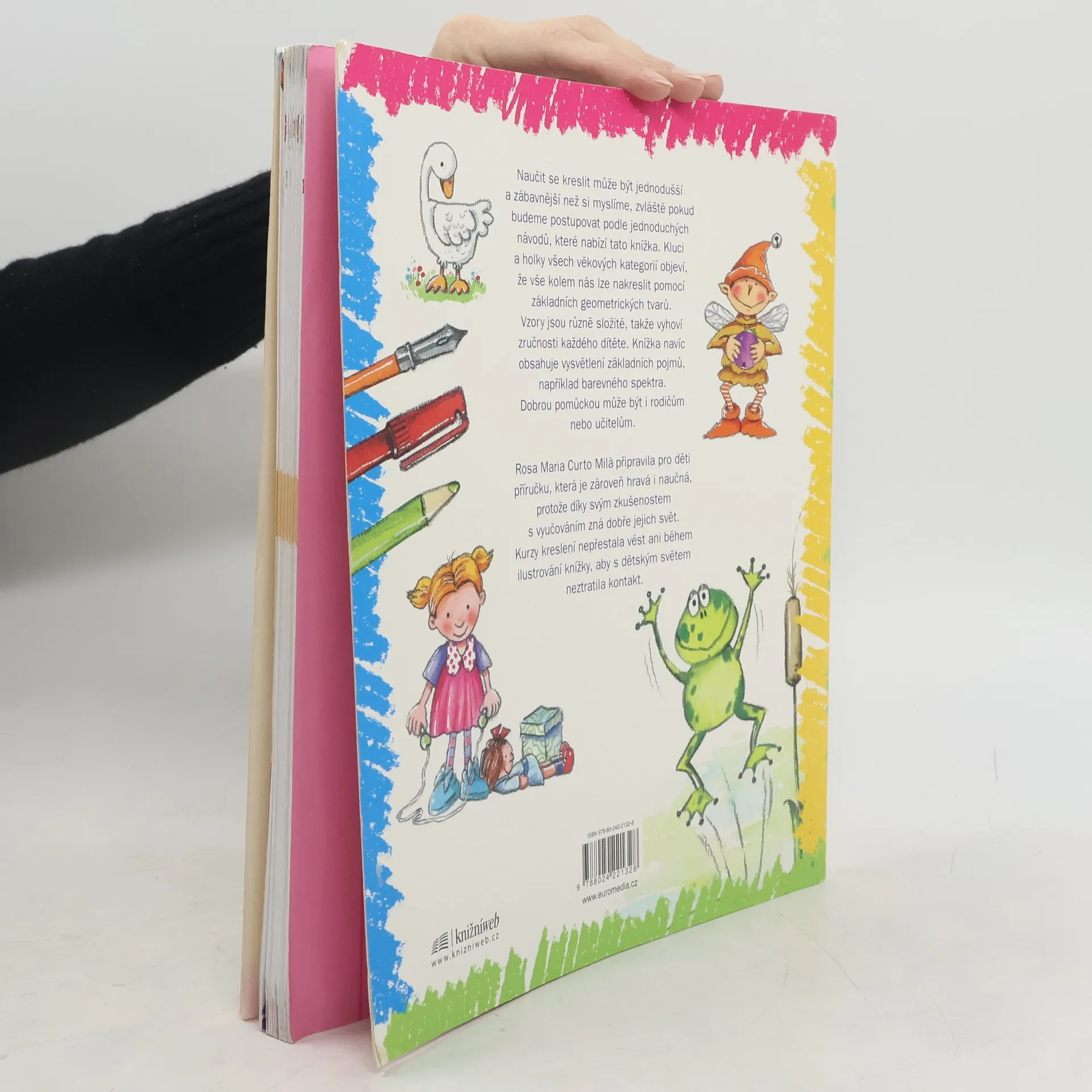 Nauč se kreslit. Příručka, která tě krok za krokem naučí kreslit vše, co vidíš kolem sebe. Rosa Maria Curto Mila tuto knížku navrhla současně hravou i didaktickou formou, protože díky svým zkušenostem s vyučováním zná dobře svět dětí. Kurzy kreslení nepřestala vést ani během ilustrování, aby s dětským světem neztratila kontakt. Kniha je určená pro kluky i holky všech věkových kategorií, naučí je nakreslilt vše kolem nás pomocí základních geometrických tvarů a vysvětlí jim některé základní pojmy, například barevné spektrum, stavbu těla apod.