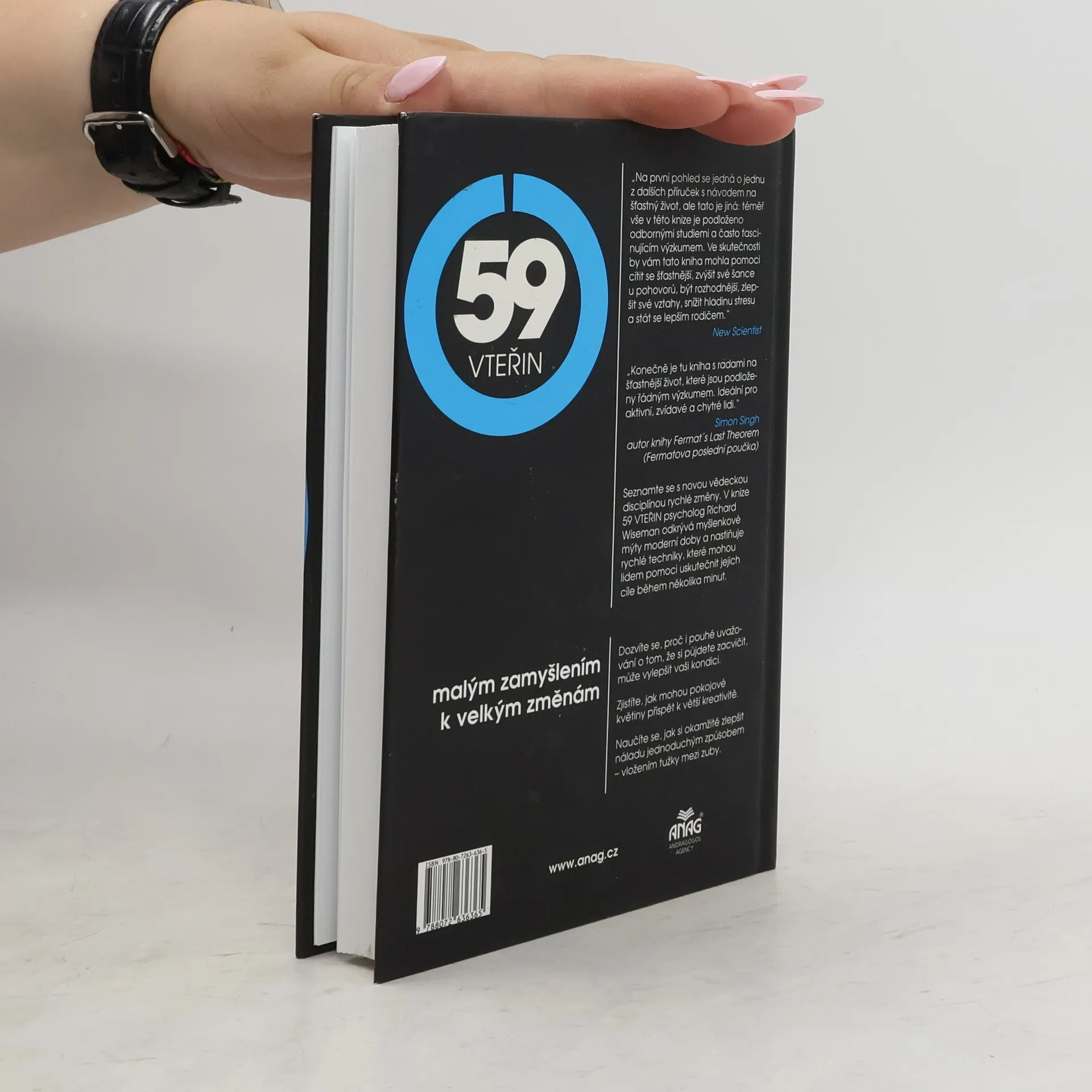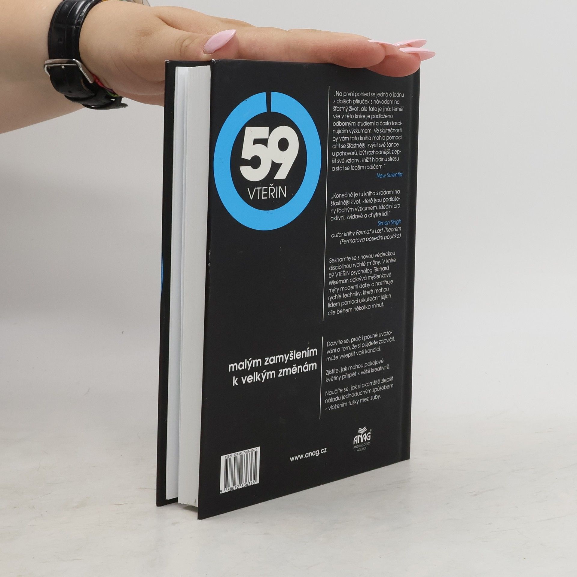Chcete vylepšit některou z důležitých stránek vašeho života? Například shodit pár kilo, najít ideálního partnera, získat práci svých snů nebo být prostě šťastnější? Pak byste měli určitě sáhnout po knize 59 vteřin! Psycholog Richard Wiseman v této převratné knize předkládá nový způsob zkvalitnění lidského života podložený seriózními výzkumy. Autor ve své knize popisuje vědecké studie zabývající se životní spokojeností a přináší efektivní doporučení, jejichž realizace netrvá moc dlouho – zhruba minutu. Témata, kterými se Richard Wiseman v knize 59 vteřin zabývá, jsou: štěstí, přesvědčování, motivace, kreativita, přitažlivost, stres, vztahy, rozhodování, rodičovství a osobnost.