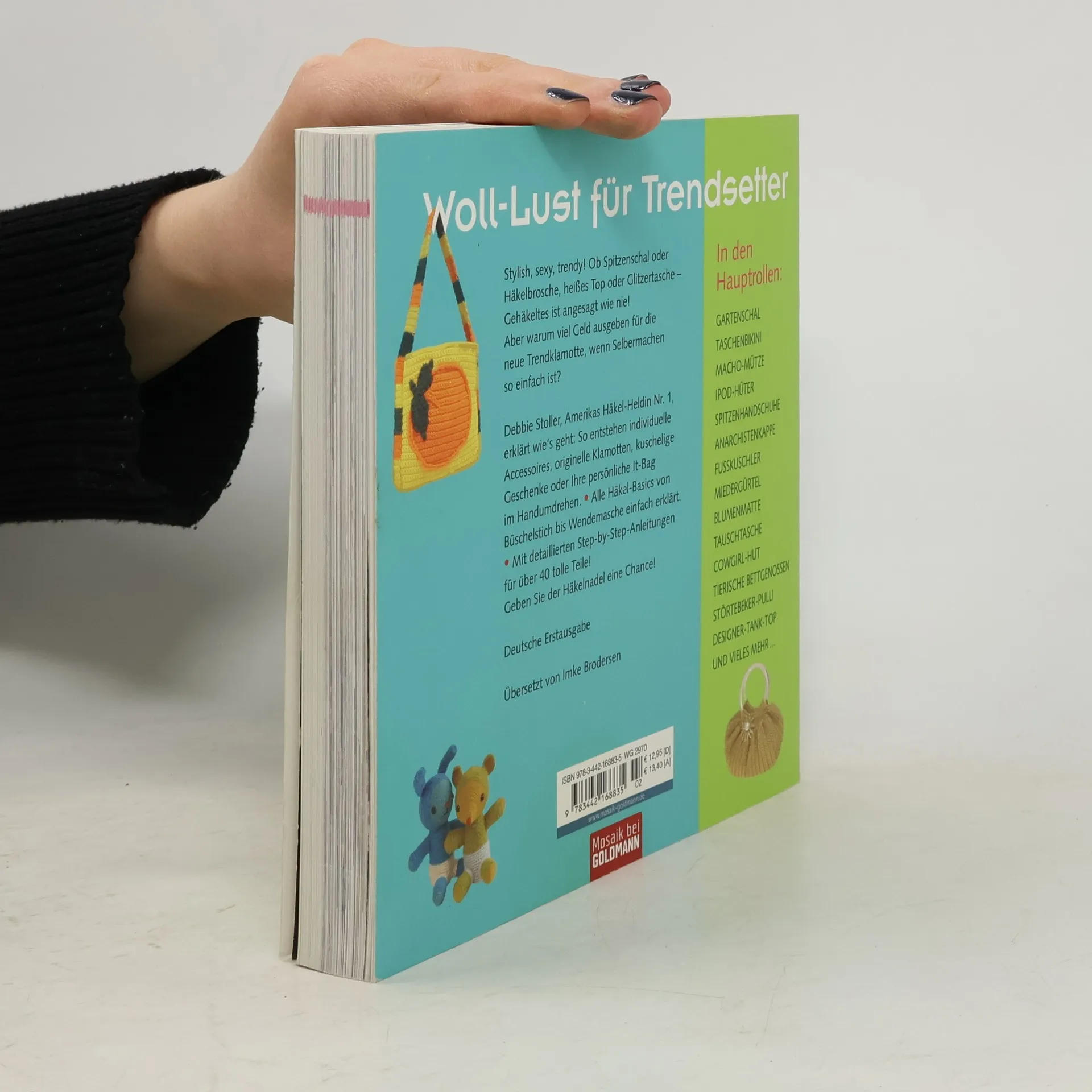 Der absolute Modetrend: Häkelsachen aller Art. Die Autorin Debbie Stoller gilt in Amerika als Superstar der neuen Handarbeitswelle. Sie stillt die Woll-Lust junger Frauen und Mädchen mit einer Fülle von aktuellen gehäkelten Tops und Jäckchen, Bikinis, schicken Taschen und witzigen Accessoires wie Blumenanstecker etc. Mit diesen Super-Geschenkideen kommt man gut an bei Schwester, Freundin und anderen netten Leuten. Ein Mode-Must von Garmisch bis Westerland. • Riesenauswahl schicker Modelle. • Mit Häkelschule und exakten Musteranleitungen. • Durchgehend farbig illustriert.