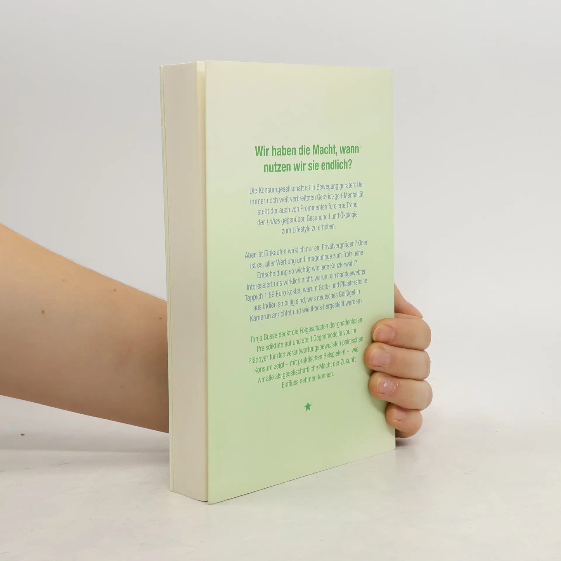 Geiz ist geil, und Shoppen macht Spaß. Doch ist Einkaufen nur ein Privatvergnügen oder eine Entscheidung von gesellschaftlicher Bedeutung? Tanja Busse deckt Skandale der modernen Produktion und Preispolitik auf und zeigt, wie Konsumenten als gesellschaftliche Macht Einfluss nehmen können. Sie gibt praktische Tipps für verantwortungsvollen Konsum. Der aufgeklärte Konsument kann zum Gegenspieler globaler Wirtschaftsmächte werden, denn Unternehmen reagieren auf verändertes Kaufverhalten schneller als auf neue Gesetze. Wir glauben oft, wirtschaftliche Prozesse seien unbeeinflussbar, doch unser Kaufverhalten bestimmt die Produktionsstandards. Wenn wir Textilprodukte aus „Exportproduktionszonen“ meiden, wo Arbeiter unter schlechten Bedingungen leiden, werden diese nicht mehr produziert. Ähnlich verhält es sich mit Orangensaft und Schokolade, deren Rohstoffe unter ausbeuterischen Bedingungen gewonnen werden. Auch die Spielzeug- und Pharmaindustrie wird nur solange Umweltgifte einsetzen, wie wir deren Produkte kaufen. Busse beleuchtet die Geschichte der Konsumkritik seit den sechziger Jahren, schafft ein theoretisches Fundament für ein modernes Selbstverständnis des Verbrauchers und zeigt, wie die Industrie mit Kundenprofilen und RFID-Chips den gläsernen Kunden anstrebt. Ihr Buch hilft Konsumenten, sich ihrer Macht bewusst zu werden und diese sinnvoll zu nutzen.
