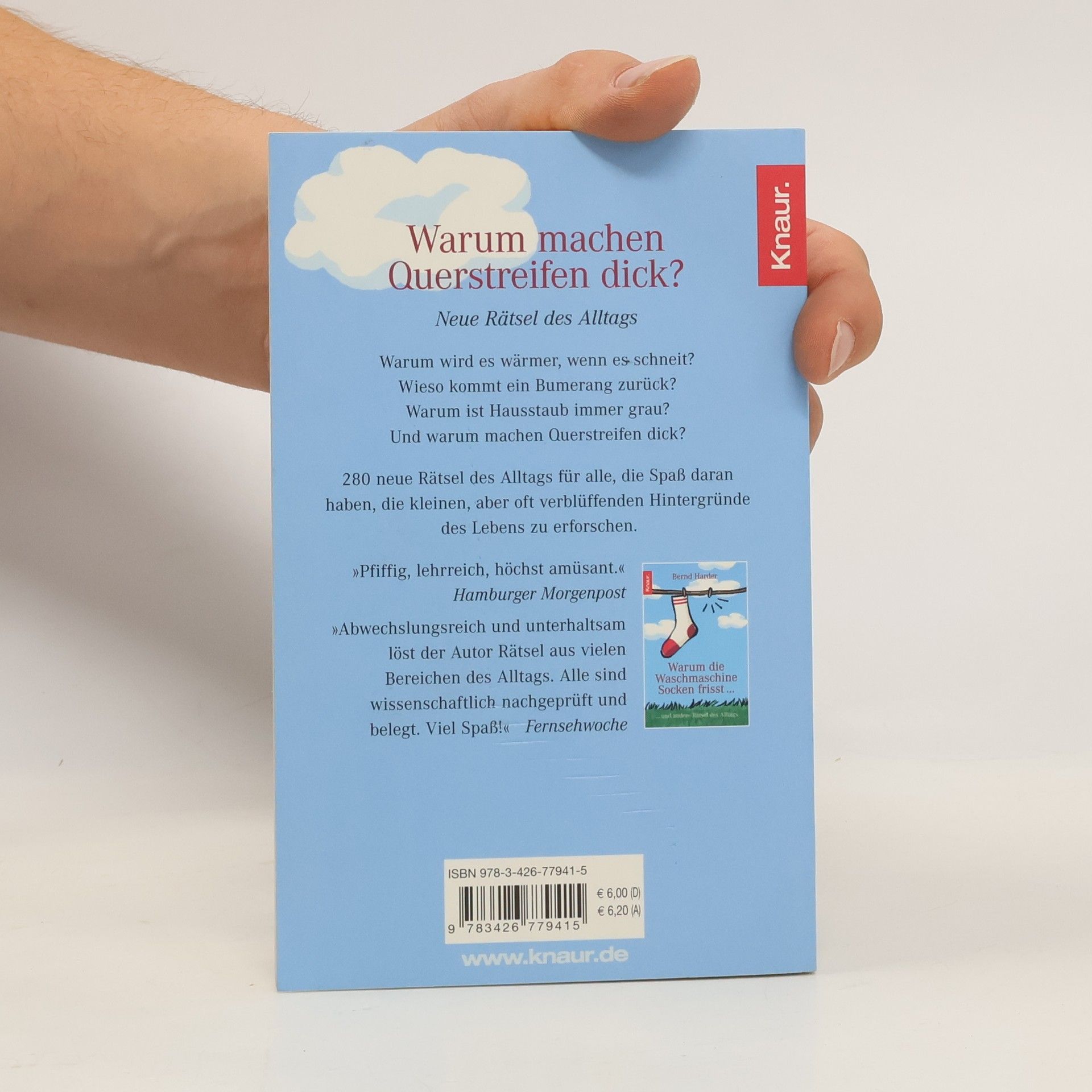 280 neue Rätsel des Alltags für alle, die Spaß daran haben, die kleinen, aber oft verblüffenden Hintergründe des Lebens zu erforschen, zum Beispiel: Warum machen Querstreifen dick? Bekanntlich trägt Obelix deswegen eine blau-weiß gestreifte Hose, weil Längsstreifen schlank machen. Umgekehrt stehen Querstreifen im Ruf, dick zu machen. Und tatsächlich sieht zum Beispiel ein quer gestreiftes Quadrat dicker aus als ein längs gestreiftes. Aber in der Mode findet diese Faustregel nicht durchgängig ihre Entsprechung. Denn es kommt bei der optischen Wirkung nicht nur auf die Streifen an, sondern genauso auf die Streifenbreite, den Schnitt und die Farbe des Kleidungsstücks.