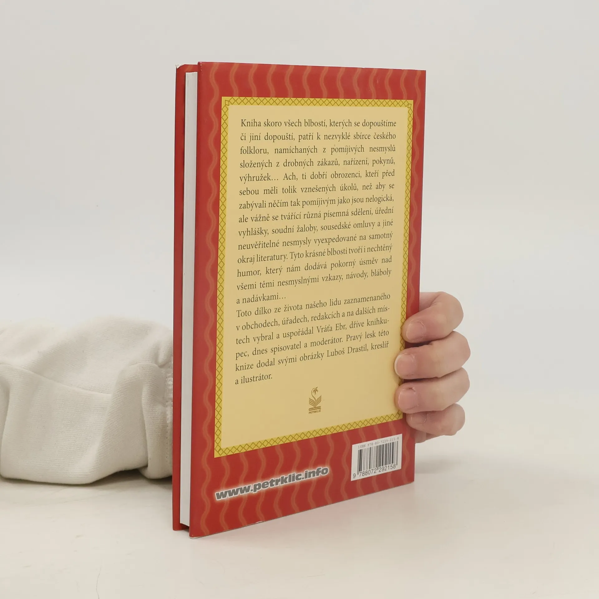 KNIHA skoro všech blbostí, kterých se dopouštíme či oni dopouští, patří k nezvyklé sbírce českého folkloru, namíchaných z pomíjivých nesmyslů složených z drobných zákazů, nařízení, pokynů, výhružek... Ach, ti dobří obrozenci, kteří před sebou měli tolik vznešených úkolů, než aby se zabývali něčím takovým pomíjivým jako jsou nelogické, ale vážně se tvářící různá písemná sdělení, úřední vyhlášky, soudní žaloby, sousedské omluvy a jiné neuvěřitelné nesmysly vyexpedované na samotný okraj literatury. Tyto krásné blbosti tvoří i nechtěný humor, který nám dodává pokorný úsměv nad všemi těmi nesmyslnými vzkazy, návody, bláboly a nadávkami... Toto dílko ze života našeho lidu zaznamenaného v obchodech, úřadech, redakcích a na dalších místech vybral a uspořádal Vráťa Ebr, dříve knihkupec, dnes moderátor. Pravý lesk této knize dodal svými obrázky LUBOŠ DRASTIL, kreslíř a ilustrátor.