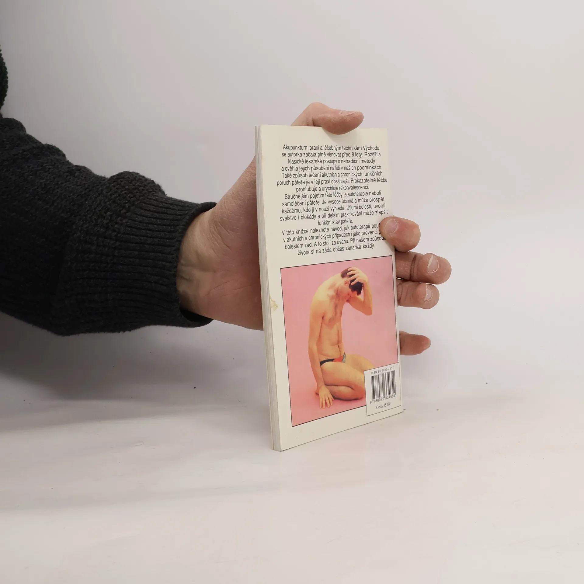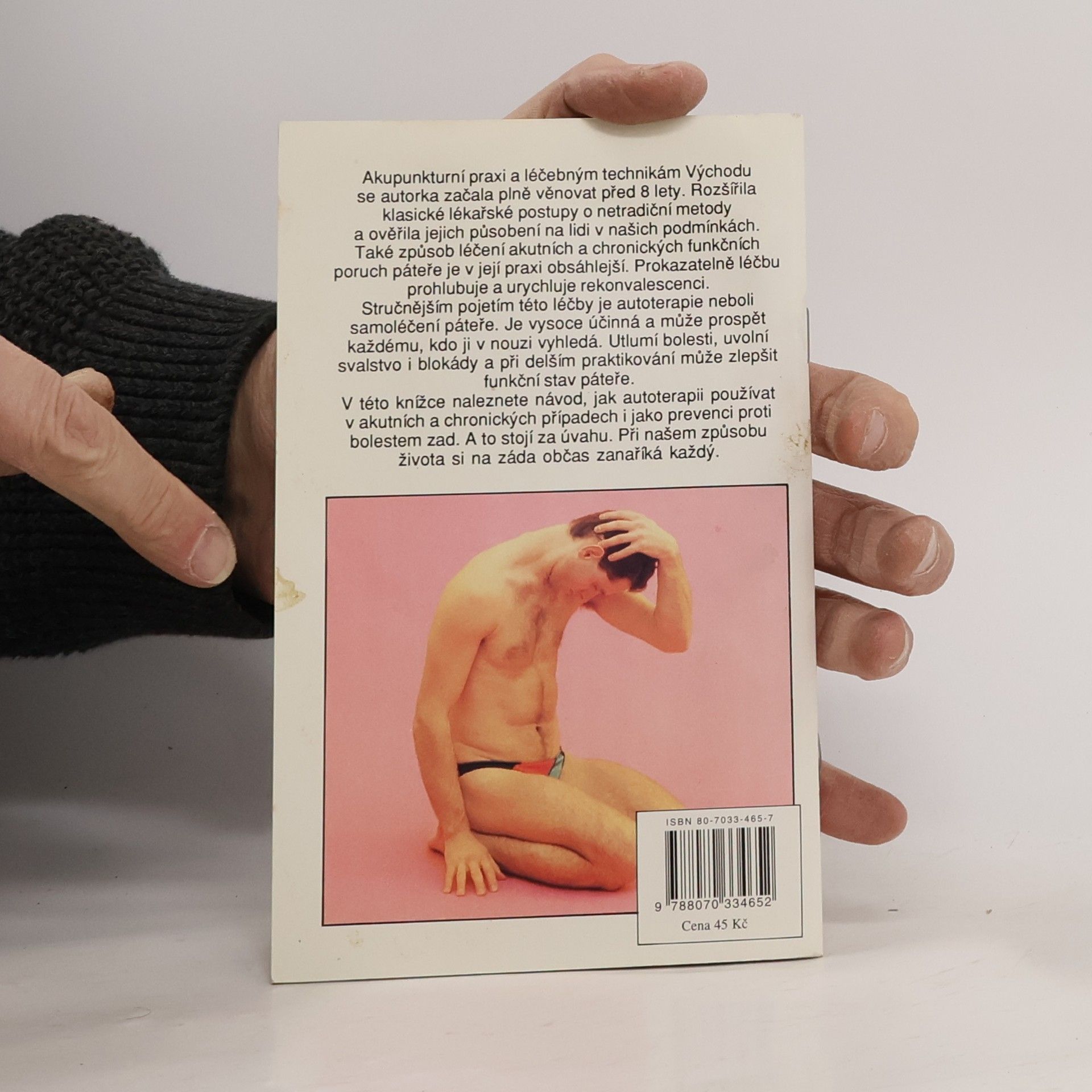 Autoterapie páteře rozcvičením, akupresurou, automasáží a automobilizačními cviky. Akupunkturní praxi a léčebným technikám Východu se autorka začala plně věnovat před 18 lety. Rozšířila klasické lékařské postupy o netradiční metody a ověřila jejich působení na lidi v našich podmínkách. Také způsob léčení akutních a chronických funkčních poruch páteře je v její praxi obsáhlejší. Prokazatelně léčbu prohlubuje a urychluje rekonvalescenci. Stručnějším pojetím této léčby je autoterapie neboli samoléčení páteře. Je vysoce účinná a může prospět každému, kdo ji v nouzi vyhledá. Utlumí bolesti, uvolní svalstvo i blokády a při delším praktikování může zlepšit funkční stav páteře. V této knížce naleznete návod, jak autoterapii používat v akutních a chronických případech i jako prevenci proti bolestem zad. A to stojí za úvahu. Při našem způsobu života si na záda občas zanaříká každý.