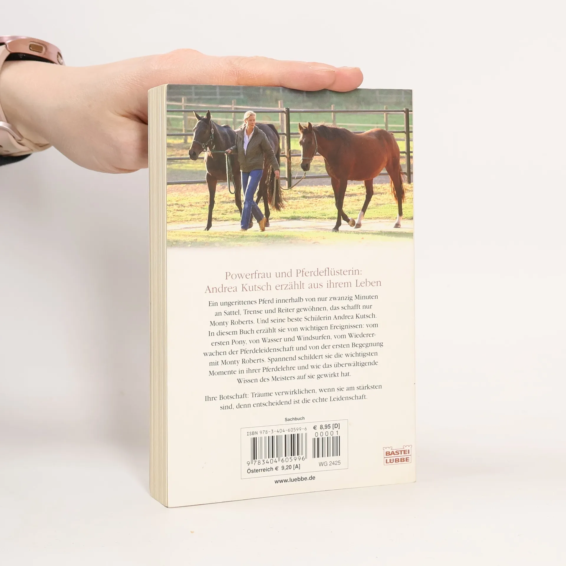 Ein ungerittenes Pferd innerhalb von nur zwanzig Minuten an Sattel, Trense und Reiter gewöhnen, das schafft nur Monty Roberts. Und seine beste Schülerin Andrea Kutsch. In diesem Buch erzählt sie von wichtigen Ereignissen: vom ersten Pony, von Wasser und Windsurfen, vom Wiedererwachen der Pferdeleidenschaft und von der ersten Begegnung mit Monty Roberts. Spannend schildert sie die wichtigsten Momente in ihrer Pferdelehre und wie das überwältigende Wissen des Meisters auf sie gewirkt hat. Ihre Botschaft: Träume verwirklichen, wenn sie am stärksten sind, denn entscheidend ist die echte Leidenschaft.