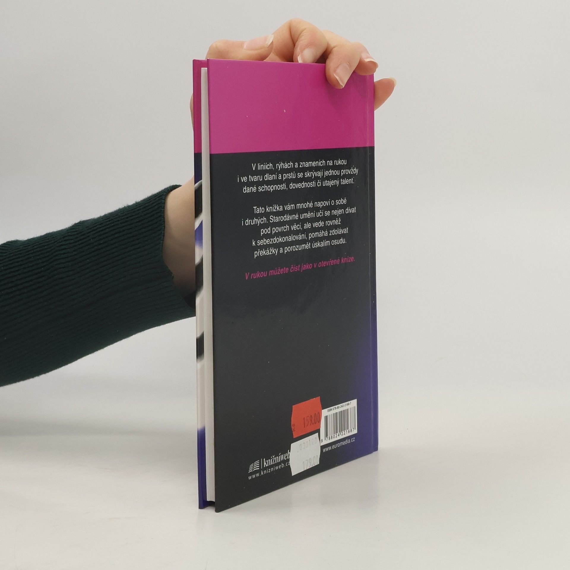 V liniích, rýhách a znameních na rukou i ve tvaru dlaní a prstů se skrývají jednou provždy dané schopnosti, dovednosti či utajený talent. Tato knížka vám mnohé napoví o sobě i druhých. Starodávné umění učí nejen dívat se pod povrch věcí, ale vede rovněž k sebezdokonalování, pomáhá zdolávat překážky a porozumět úskalím osudu. V rukou můžete číst jako v otevřené knize.