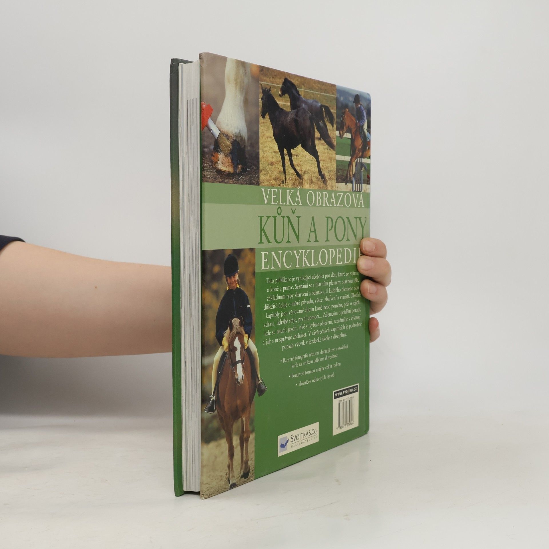 Tato publikace je vynikající učebnicí pro děti, které se zajímají o koně a ponye. Seznámí se s hlavními plemeny, stavbou těla, základními typy zbarvení a odznaky. U každého plemene jsou důležité údaje o místě původu, výšce, zbarvení a využití. Obsáhlé kapitoly jsou věnované chovu koně nebo ponyho, péči o jejich zdraví, údržbě stáje, první pomoci... Zájemcům o ježdění poradí, kde se naučit jezdit, jaké so vybrat oblečení, seznámí je s výstrojí a jak s ní správně zacházet. V závěrečných kapitolách je podrobně popsán výcvik v jezdecké škole a disciplíny. Barevné fotografie názorně doplňují text a osvětlují krok za krokem odborné dovednosti. Poutavou formou zaujme celou rodinu. Slovníček odborných výrazů.