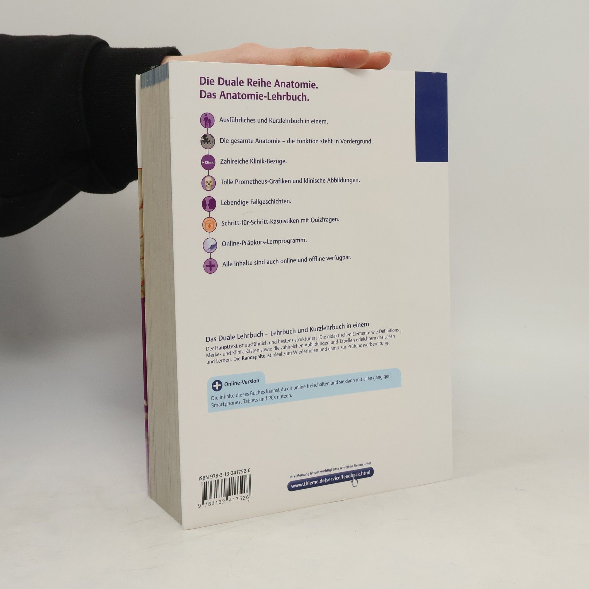 Das Anatomie-Lehrbuch im bewährten Duale Reihe-Konzept – Lehrbuch und Kurzlehrbuch in einem. Der Schwerpunkt liegt auf der funktionellen Betrachtung der Anatomie. Viele praxis- und klinikorientierte Bezüge, exzellente PROMETHEUS-Grafiken, tolle klinische Abbildungen und zahlreiche Helferlein unterstützen dich optimal beim Lernen. Der gesamte Inhalt wird durch Fallbeispiele aus dem Klinikalltag lebendig untermalt – so macht Lernen richtig Spaß. Verstehe und bestehe die Anatomie und sei perfekt auf die darauf folgenden Semester vorbereitet. Mit der kostenlosen eRef App hast du zahlreiche Inhalte auch offline immer griffbereit.