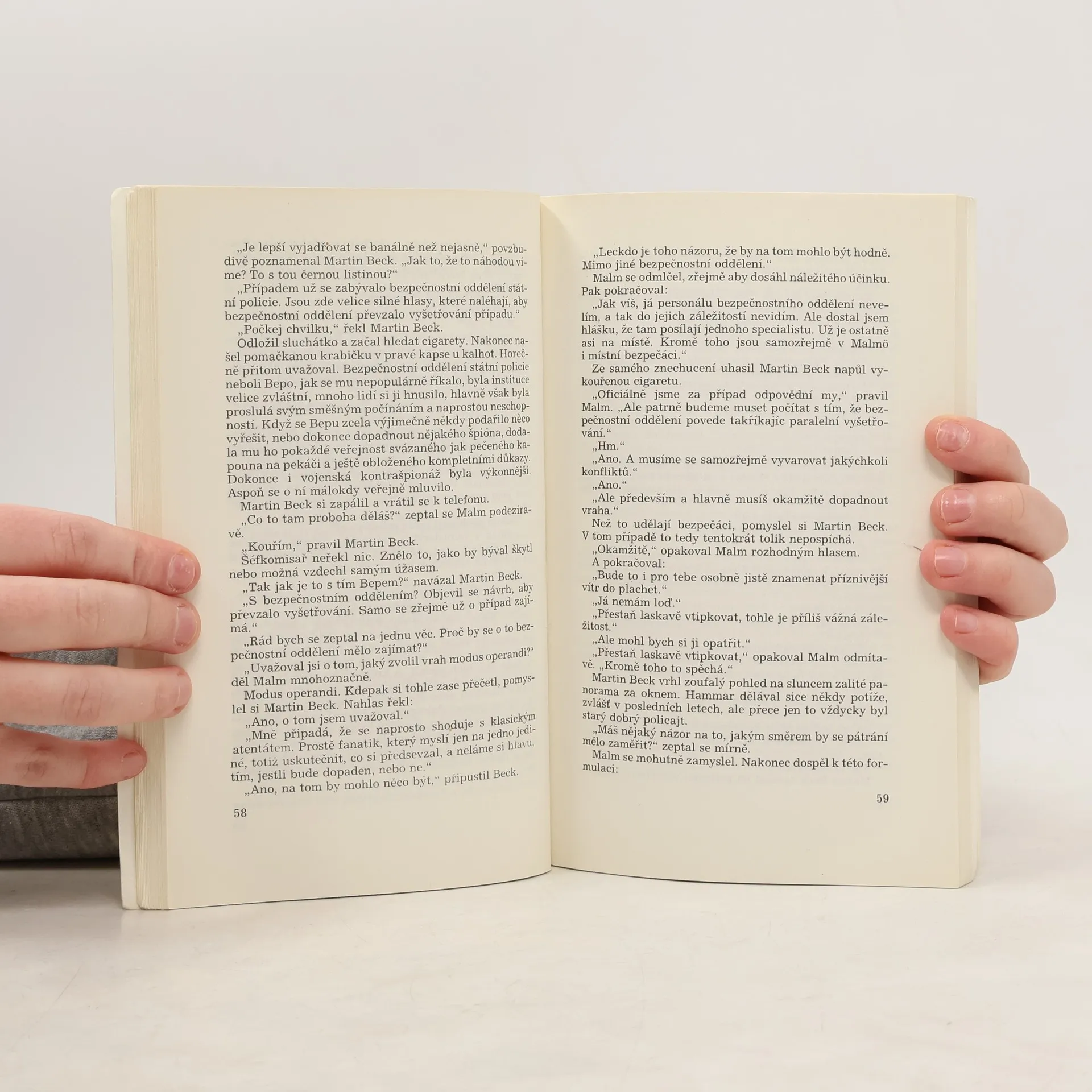 Šestý román z deseti, napsaných švédskou dvojicí spisovatelů. Významný finanční magnát Viktor Palmgren je zastřelen neznámým mužem uprostřed slavnostního večírku v hotelu Savoy. Kvůli lehce opožděné reakci řadových policistů střelec uniká a nezůstává po něm jediná stopa. Vzhledem k tomu, že se vyšetřovatelé brzy dostávají s případem do slepé uličky, vyžádají si na pomoc komisaře Martina Becka. Ten se však rychle zamotává do spletitých intrik vrcholné politiky a businessu… Ze švédského originálu „Polis, polis, potatismos!“, vydaného nakladatelstvím P.A. Norstedt och Söners Förlag, Stockholm 1970, přeložil František Fröhlich. Vydání druhé, v Nakladatelství Svoboda první.