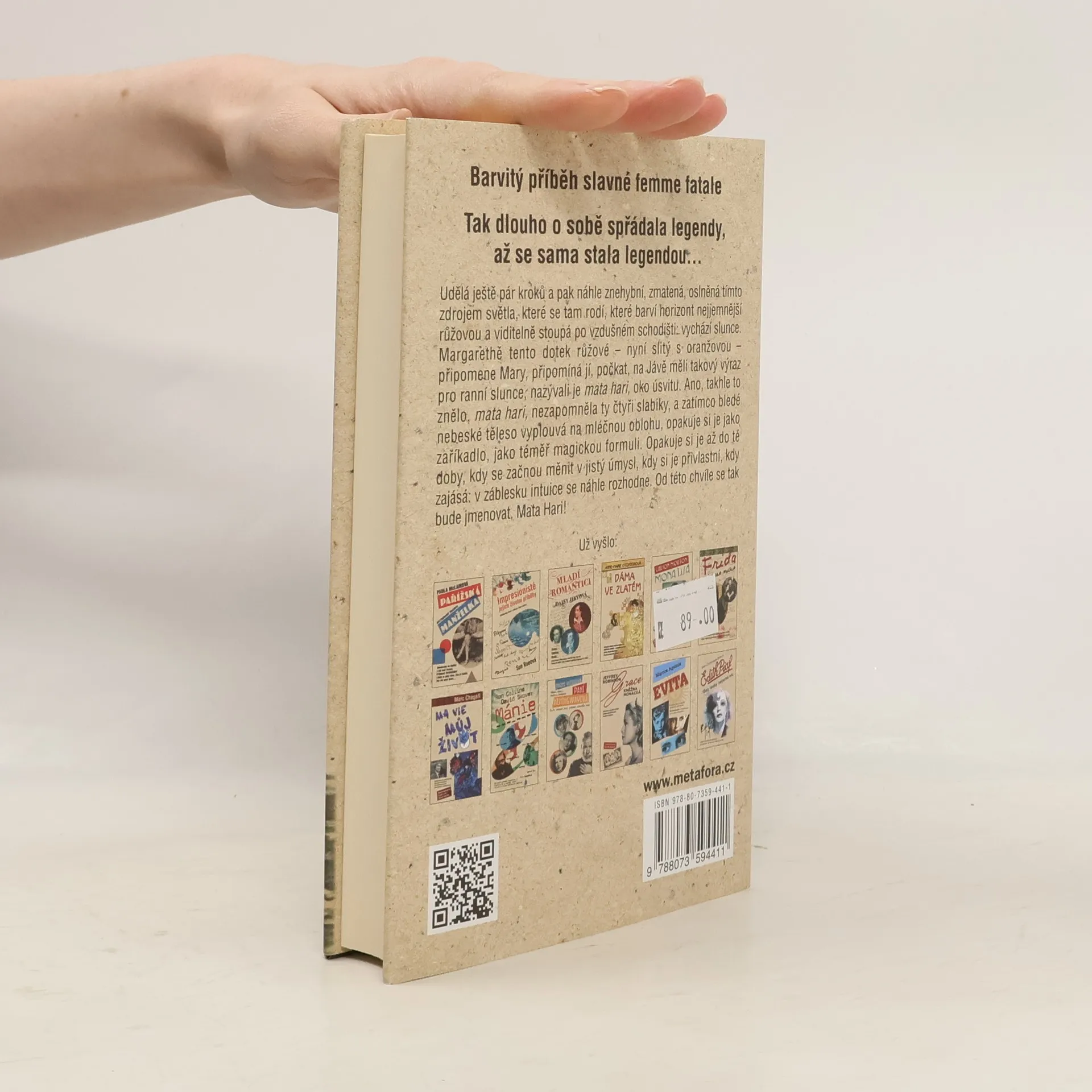 Tajemná dáma v srdci první světové války. Tak dlouho o sobě spřádala legendy, až se sama stala legendou… Mata Hari… jméno, které se stalo synonymem špionky. Osud tak neuvěřitelný, že prostý životopis působí fantastičtěji než vymyšlený příběh. „Rychle mě obejměte, polibte a nechte mě. Stoupněte si po mé pravici. Budu se na vás dívat. Sbohem.“ To jsou poslední slova, která Mata Hari pronesla, když 15. října 1917 stanula před popravčí četou. Co tomu ale předcházelo? Kde začala a kudy vedla její spletitá, neuvěřitelná cesta? Jak se z chudého nizozemského děvčátka s obyčejným jménem Margaretha Zelleová stala mysteriózní tanečnice Mata Hari, milenka mnoha významných mužů, špionka a nakonec odsouzenkyně na smrt? Ve zlaté éře, belle époque, pobláznila celou Paříž, zlomila mnohá srdce a její jméno letělo od úst k ústům. Všichni uvěřili, že je Orientálka a chrámová služebnice bohů, všichni podlehli jejím barvitým mystifikacím. Autorce se podařilo napsat životopisný román s nejvyšším respektem k historickým faktům, ale současně nesmírně niterný a strhující. Vyprávění v přítomném čase, překrásným, lehce archaickým jazykem, působí dojmem, jako bychom se vskutku ocitli na počátku minulého století a jako by se to všechno – události bizarní, komické i tragické – odehrávalo přímo teď, přímo před námi…