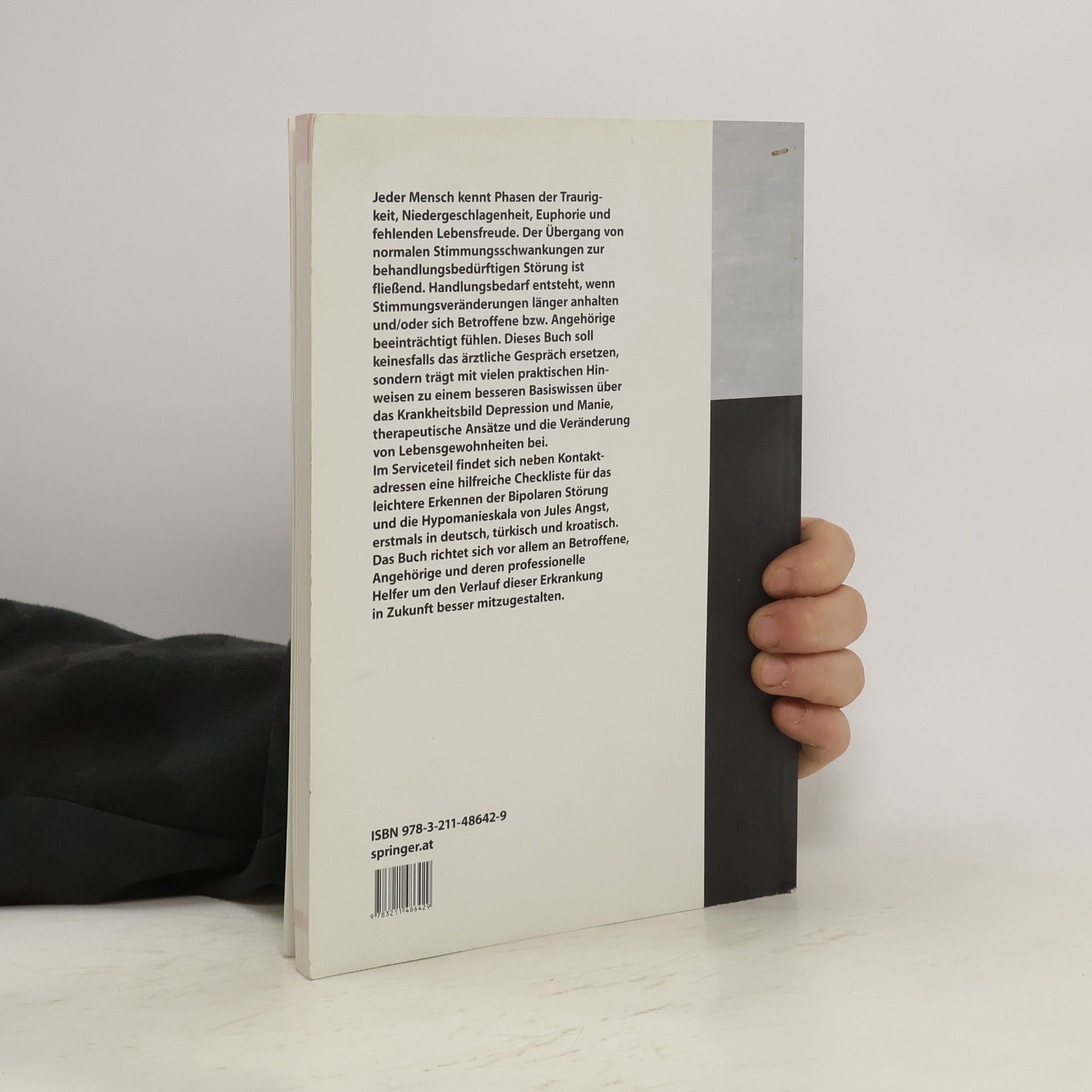 Jeder Mensch kennt Stimmungsschwankungen wie Phasen der Traurigkeit, Niedergeschlagenheit, der Euphorie und fehlender Lebensfreude. Die Übergänge von der normalen Entwicklung zur behandlungsbedürftigen Störung sind fließend. Ein Handlungsbedarf entsteht, wenn die Stimmungsveränderungen länger anhalten und die Betroffenen oder Angehörigen sich in ihrem Erleben oder Funktionierem im Alltag beeinträchtigt fühlen. Die behutsame und stetige Auseinandersetzung mit der Erkrankung ist ein Prozess, der seine Zeit und vielleicht auch mehrere Krankheitsepisoden braucht. Dieses Buch für Betroffene soll keinesfalls das ärztliche Gespräch ersetzen, sondern zu einem besseren Basiswissen über Stimmungsschwankungen, über mögliche therapeutische Ansätze und Veränderung von Lebensgewohnheiten beitragen. Obwohl wir bis heute nicht wissen, was dieses Leiden letztendlich verursacht, sind Betroffene und deren Angehörige diesen Stimmungsschwankungen nicht länger ausgeliefert und können den weiteren Verlauf sehr gut mitgestalten.