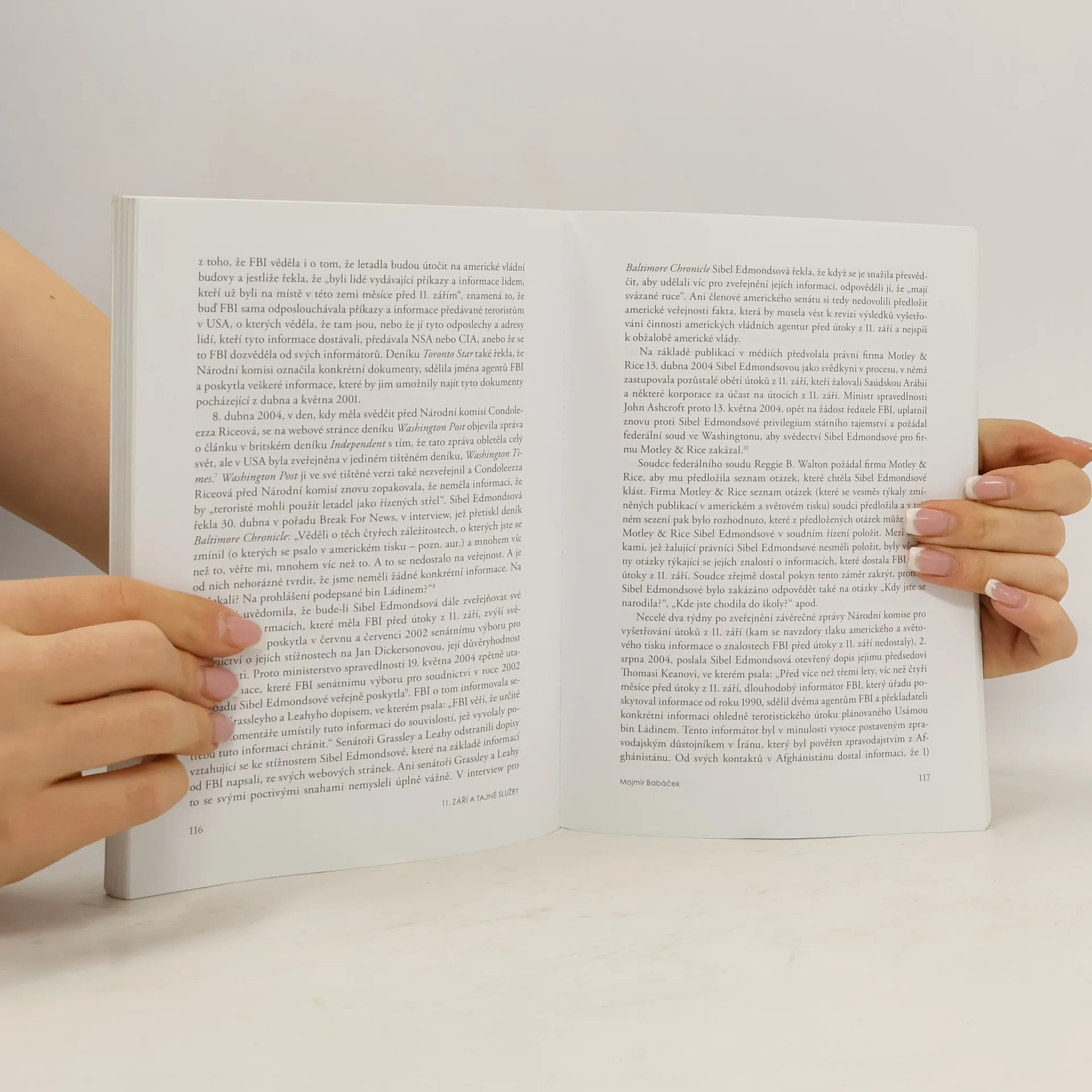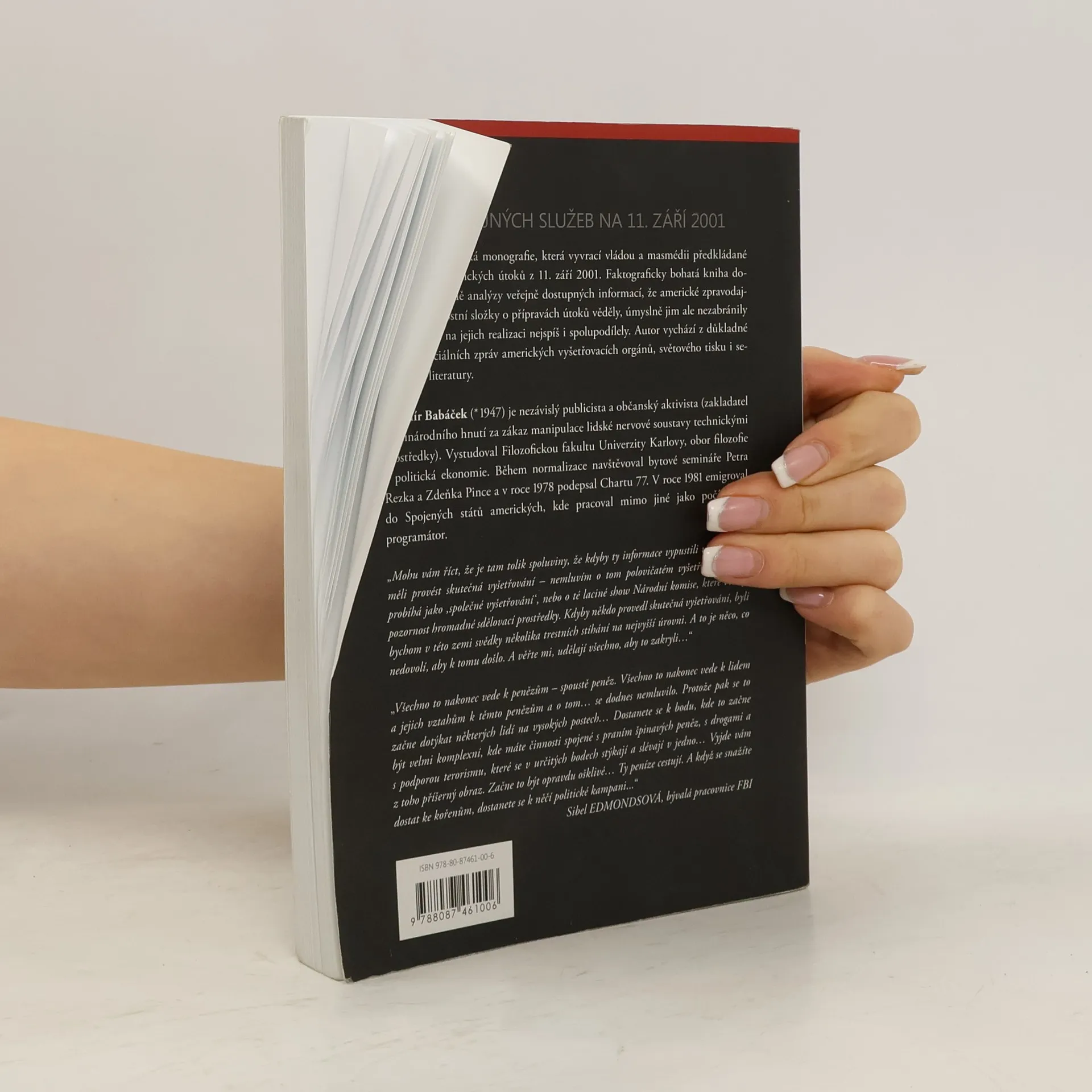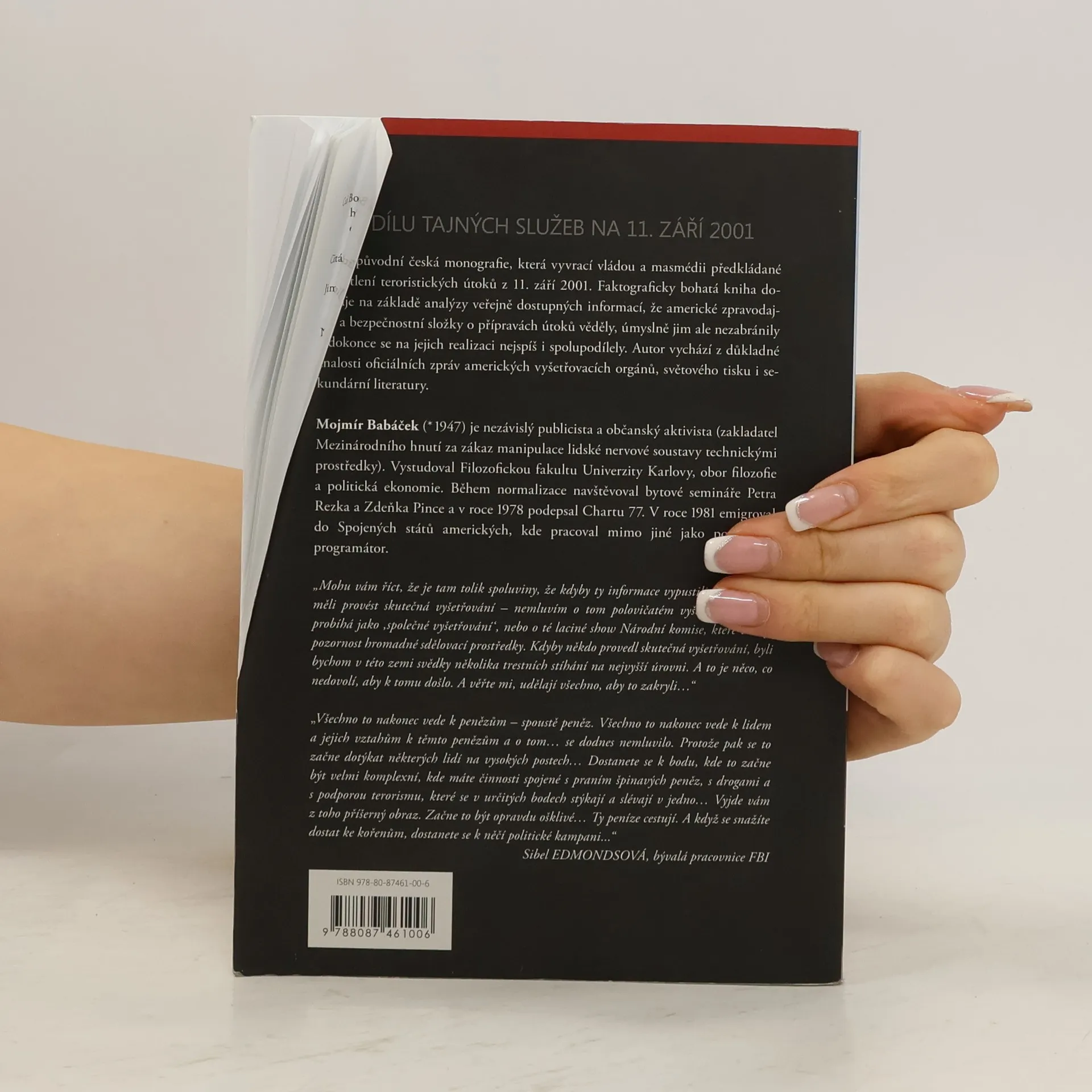 Autor analyzuje práci amerických zpravodajských služeb před útoky z 11. září, porovnává zprávy o ní od amerických vyšetřovacích orgánů s fakty, která se dostala na veřejnost a usvědčují tyto orgány z manipulací s nimi a často i ze lži. Analýza vede k závěru, že americké zpravodajské služby o přípravách útoků od počátku věděly a ve svých databázích se snažily tyto své znalosti zakrýt. Kniha také přináší nejnovější vědecké důkazy o víc než pravděpodobném podílu agentur americké vlády na realizaci útoků z 11. září. Mojmír Babáček (* 1947) je nezávislý publicista a občanský aktivista (zakladatel Mezinárodního hnutí za zákaz manipulace lidské nervové soustavy technickými prostředky). Vystudoval Filozofickou fakultu Univerzity Karlovy, obor filozofie a politická ekonomie. Během normalizace navštěvoval bytové semináře Petra Rezka a Zdeňka Pince a v roce 1978 podepsal Chartu 77. V roce 1981 emigroval do Spojených států amerických, kde pracoval mimo jiné jako počítačový programátor.