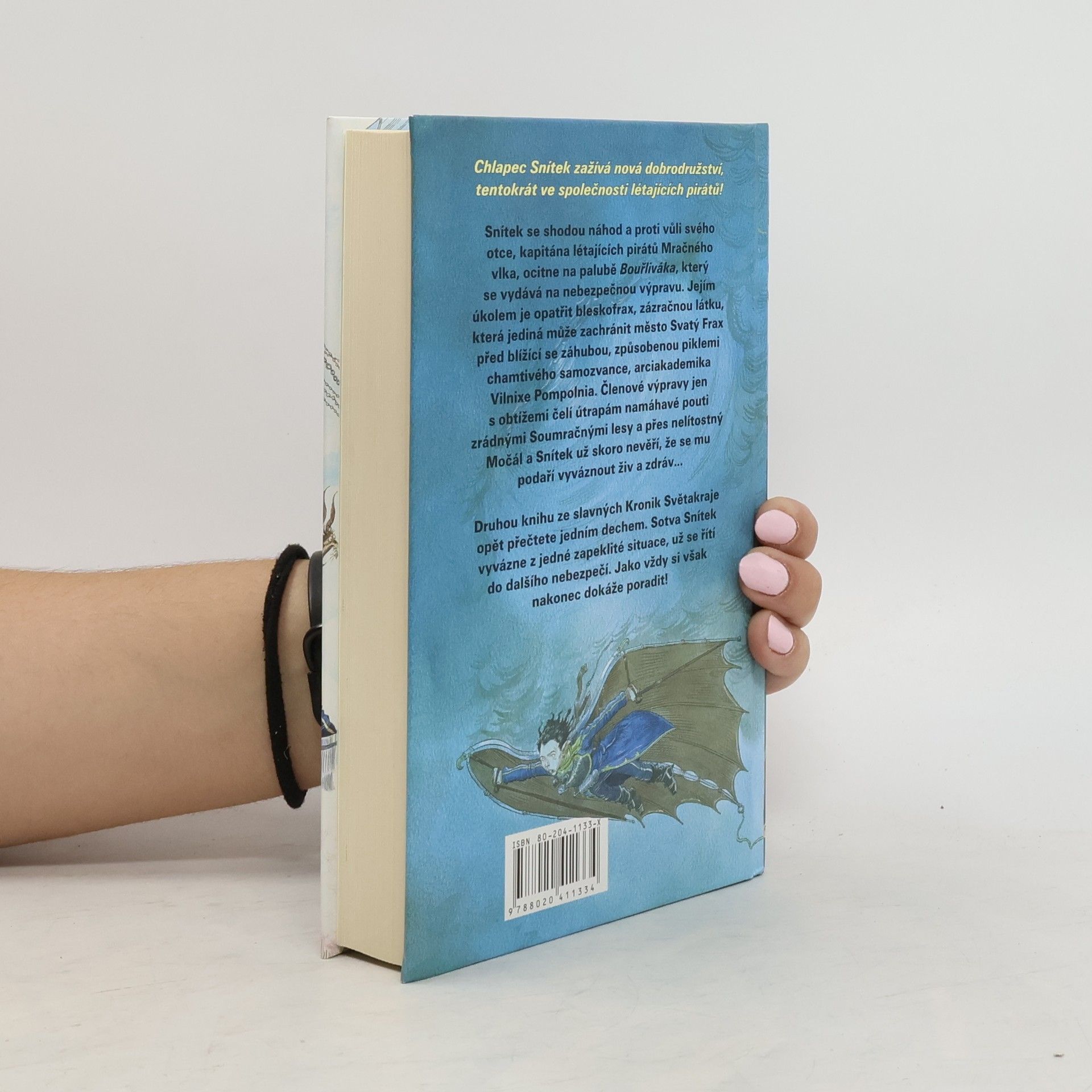 Chlapec Snítek zažívá nová dobrodružství, tentokrát ve společnosti létajících pirátů! Snítek se shodou náhod a proti vůli svého otce, kapitána létajících pirátů Mračného vlka, ocitne na palubě Bouřliváka, který se vydává na nebezpečnou výpravu. Jejím úkolem je opatřit bleskofrax, zázračnou látku, která jediná může zachránit město Svatý Frax před blížící se záhubou, způsobenou piklemi chamtivého samozvance, arciakademika Vilnixe Pompolnia. Členové výpravy jen s obtížemi čelí útrapám namáhavé pouti zrádnými Soumračnými lesy a přes nelítostný Močál a Snítek už skoro nevěří, že se mu podaří vyváznout živ a zdráv… Druhou knihu ze slavných Kronik Světakraje opět přečtete jedním dechem. Sotva Snítek vyvázne z jedné zapeklité situace, už se řítí do dalšího nebezpečí. Jako vždy si však nakonec dokáže poradit!... celý text