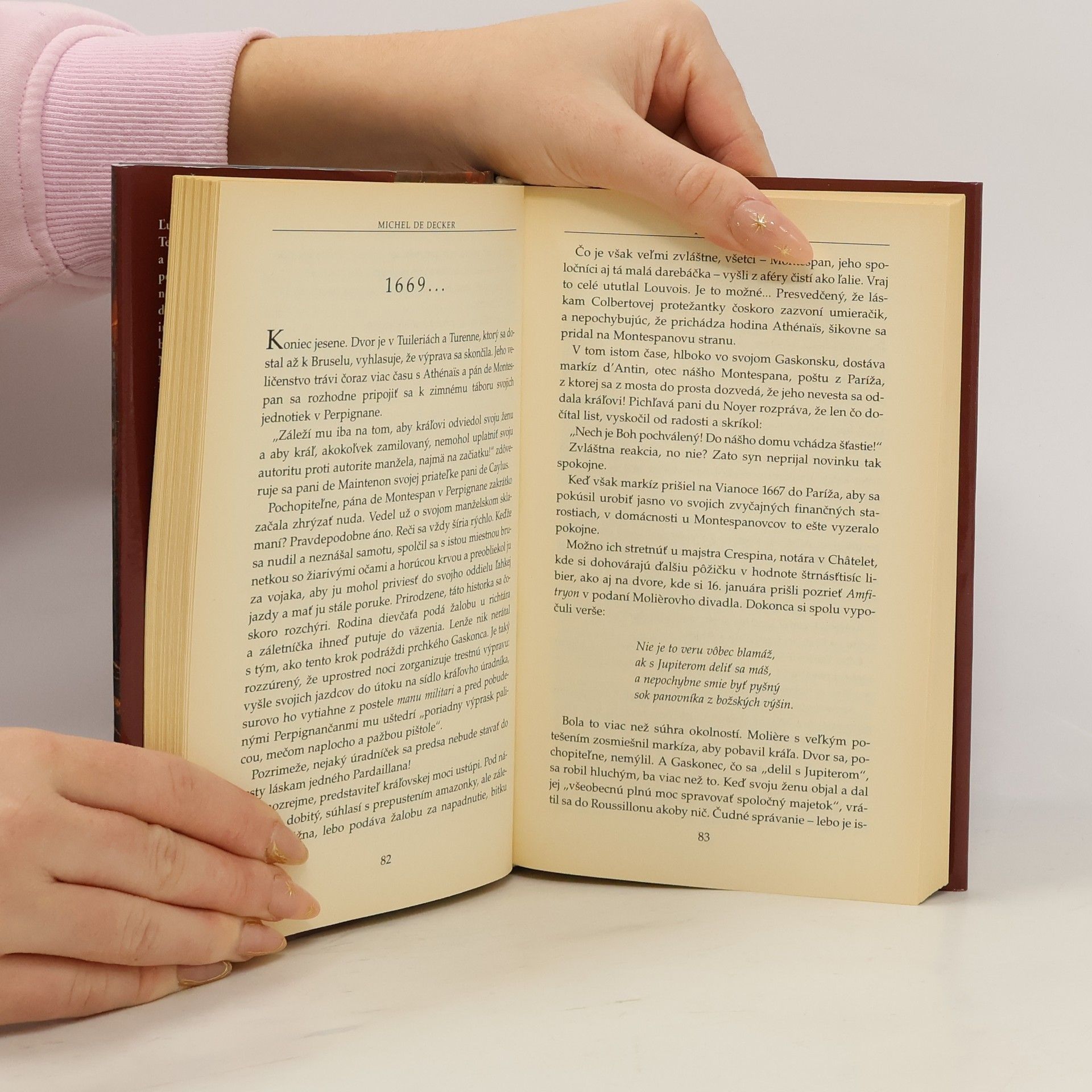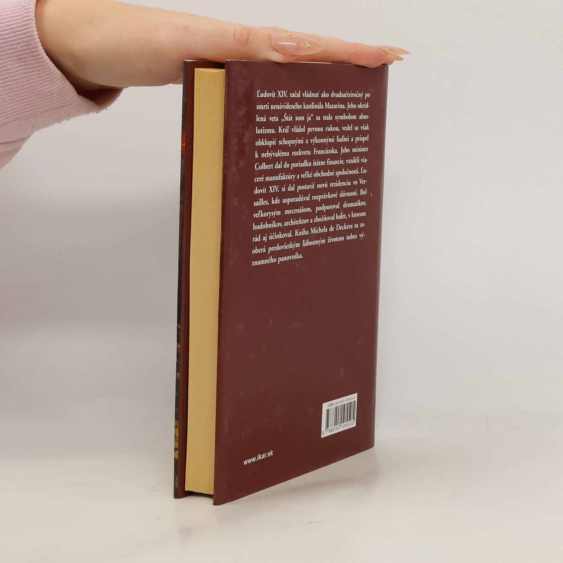 Ľudovít XIV. začal vládnuť ako dvadsaťtriročný. Jeho okrídlená veta „štát som ja“ sa stala symbolom absolutizmu. Kráľ vládol pevnou rukou, vedel sa však obklopiť schopnými a výkonnými ľuďmi a prispel k nebývalému rozkvetu Francúzska. Jeho minister Colbert dal do poriadku štátne financie, vznikli viaceré manufaktúry a veľké obchodné spoločnosti. Ľudovít XIV. si dal postaviť novú rezidenciu vo Versailles, kde usporadúval rozprávkové slávnosti. Kniha Michela de Deckera sa zaoberá predovšetkým ľúbostným životom tohto významného panovníka.