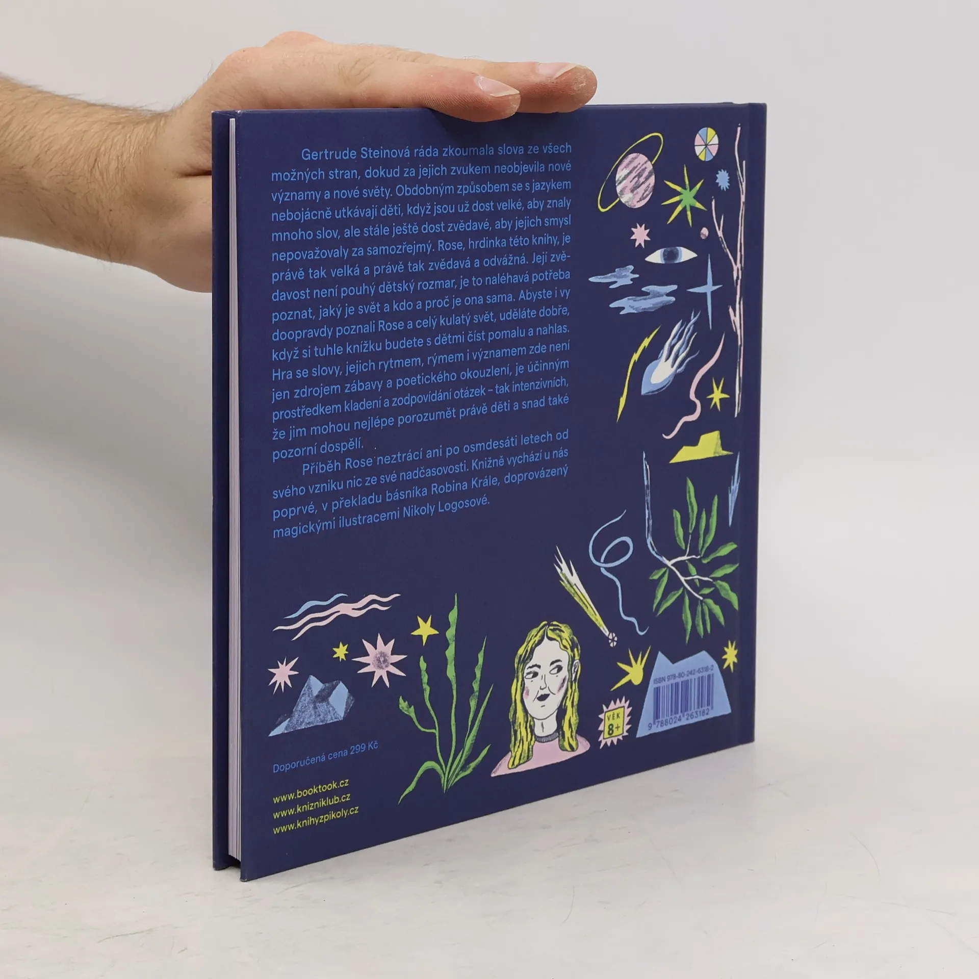 Rose, hrdinka této knihy, je právě tak velká a právě tak zvědavá a odvážná. Její zvědavost není pouhý dětský rozmar, je to naléhavá potřeba poznat, jaký je svět a kdo a proč je ona sama. Abyste i vy doopravdy poznali Rose a celý kulatý svět, uděláte dobře, když si tuhle knížku budete s dětmi číst pomalu a nahlas. Hra se slovy, jejich rytmem, rýmem i významem zde není jen zdrojem zábavy a poetického okouzlení, je účinným prostředkem kladení a zodpovídání otázek, tak intenzivních, že jim mohou nejlépe porozumět právě děti a snad také pozorní dospělí. Text známé umělecké osobnosti 20. století Gertrude Steinové neztrácí ani po osmdesáti letech od svého vzniku na nadčasovosti. Knižně vychází u nás poprvé, v překladu Robina Krále, doprovázený magickými ilustracemi Nikoly Logosové.